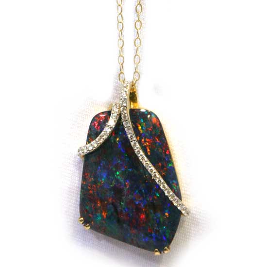 The gorgeous necklace captures your heart at the first glance with the large, uniquely shaped opal stone. The 14K gold chain secures the lustrous opal pendant while adding extra shine to the necklace. Embraced by luxurious, twinkling diamonds, this beautiful opal necklace is surely a deserving one to be loved.