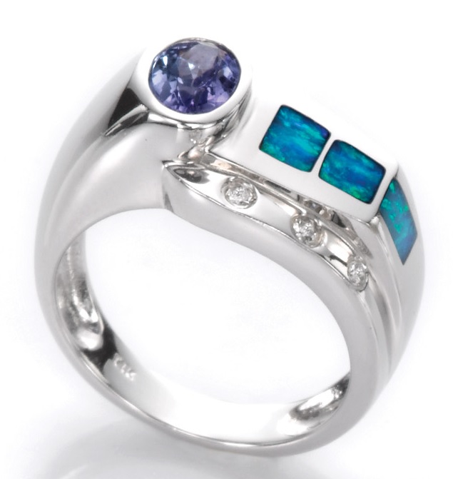 Australian Opal Inlay Gold Ring with Tanzanite and Diamond