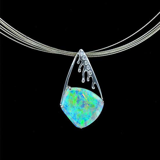This pendant features a 14k white gold setting fitted with an Australian opal and crystals. The opal main stone shows charming blue, green and red internal colors. The well-designed pendant goes well with your elegant outfits.
