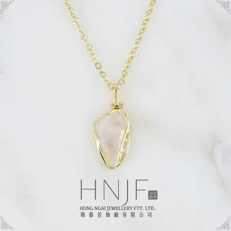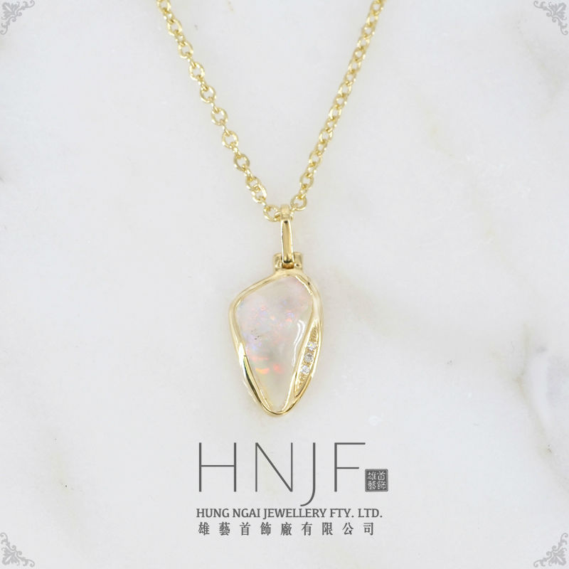 Be the center of attention with this opal pendant dangling around your neck. A solid Australia white opal is set against delicate 18k yellow gold outline with tiny diamond embellishments. The freeform flair exudes a carefree character while adding a touch of elegance to versatile apparel.