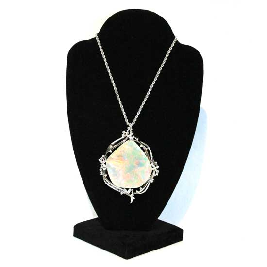 This gorgeous necklace features a large opal pendant. The opal comes in a pear shape and is polished to give out alluring luster. The delicate setting is embellished with diamonds to show extra glamor.