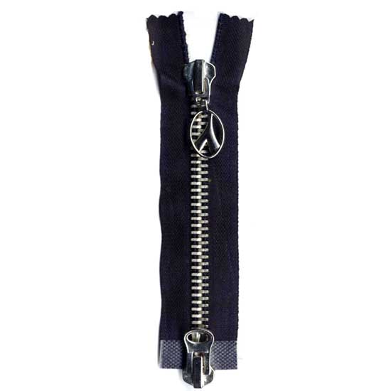 Featuring two different styles of zip puller on both ends, this open-ended zipper provides a convenient two-way design which is best sewn on jackets and clothes. The zipper comes with black tape and contrasting silvery teeth, bringing a classy touch on your garments. The metal zip puller also flaunts an inverted Y-shaped crafted detail encircled by a hoop for an added touch.