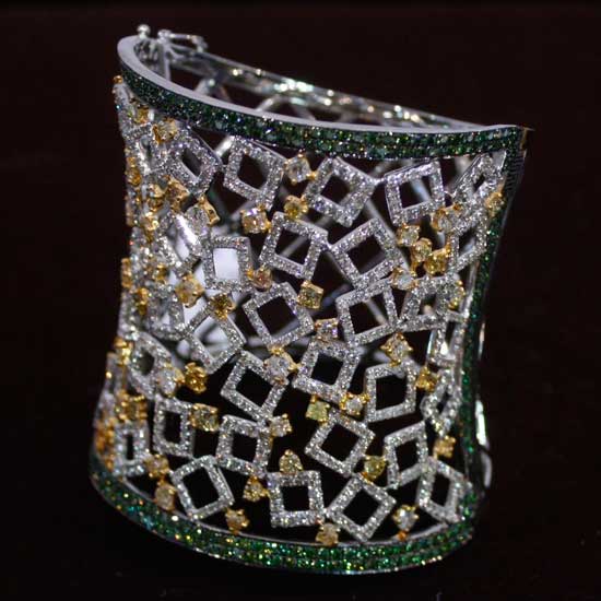 Featured is a diva-style bangle accented with elegant openwork details. The exquisite piece is crafted with 18K white gold and yellow diamonds. It makes an eye-catching accessory to go with your polished look.