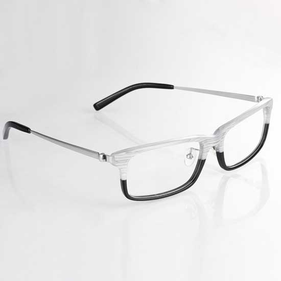 Displayed is an optical frame that is made of acetate and metal for a light weight and durability. The upper halves of the rims are designed with a striped pattern while the lower halves are in black for a stylish contrasting effect. The temples, with a metallic luster, are joined by black acetate temple tips to complete the fashionable look.