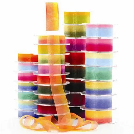 Showcased is a series of organdy ribbons coming in rolls. The ribbons feature a semi-transparent look in wonderful gradated colors. These beautiful ribbons brighten any designs of gift packaging.