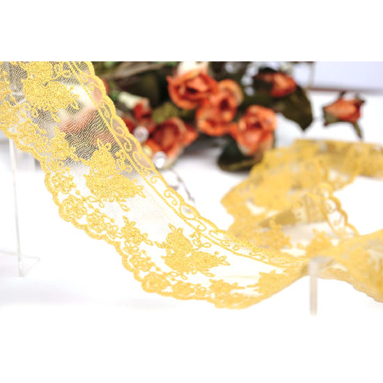 Showcased here is an organza lace that features elaborate floral patterns. Its beautiful shell hemline looks adorable and sophisticated. This lace can be used in the trimming of home textiles and decoration products.