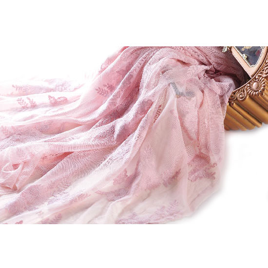 Featured here is a lace fabric designed with fine patterns of small leaves. This semi-transparent, lightweight material can be added to ladies' garment as detail. Its sweet pink color flaunts a youthful touch of spring.