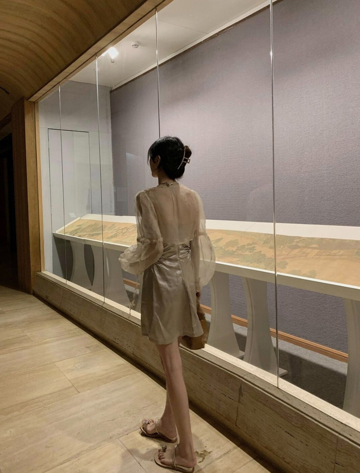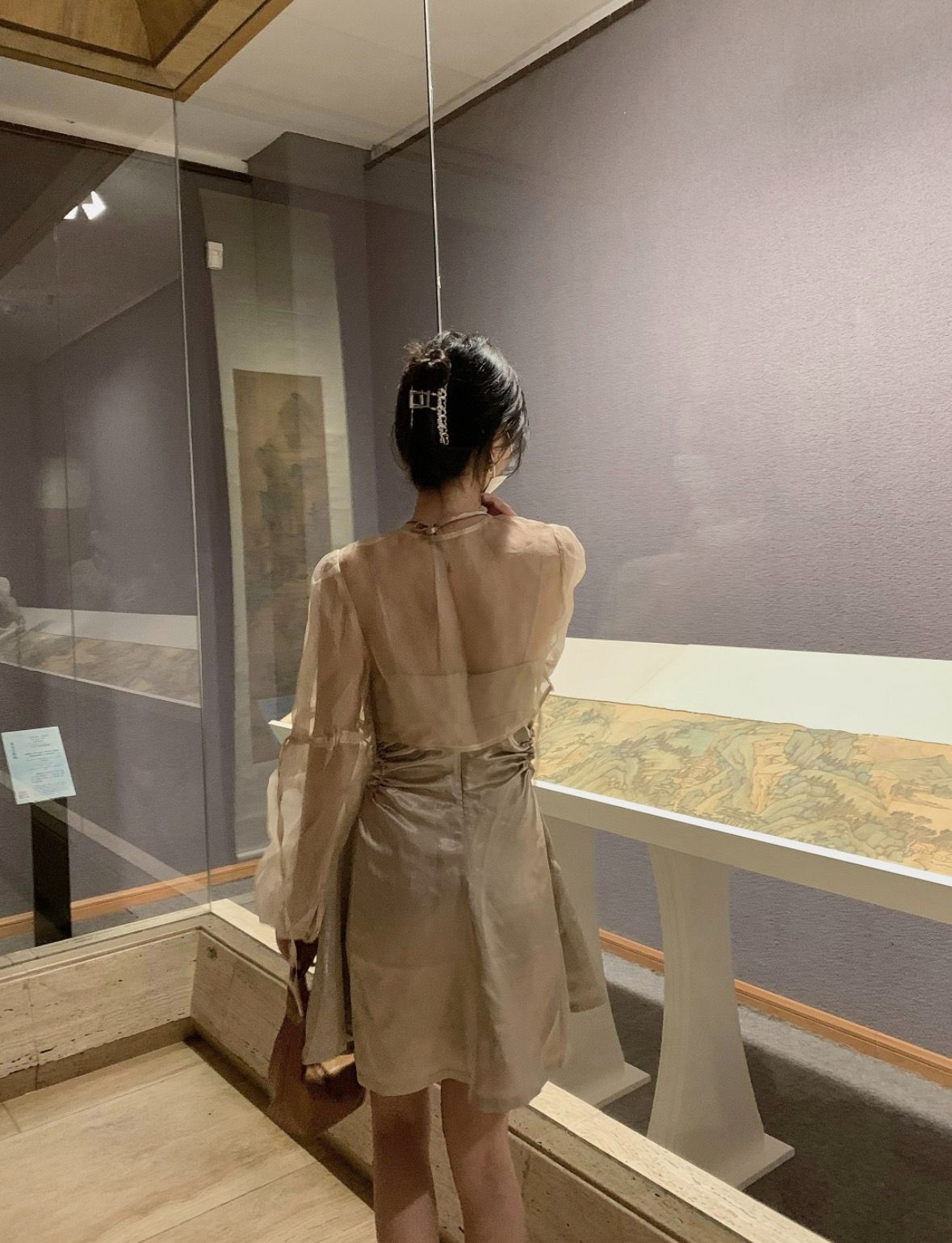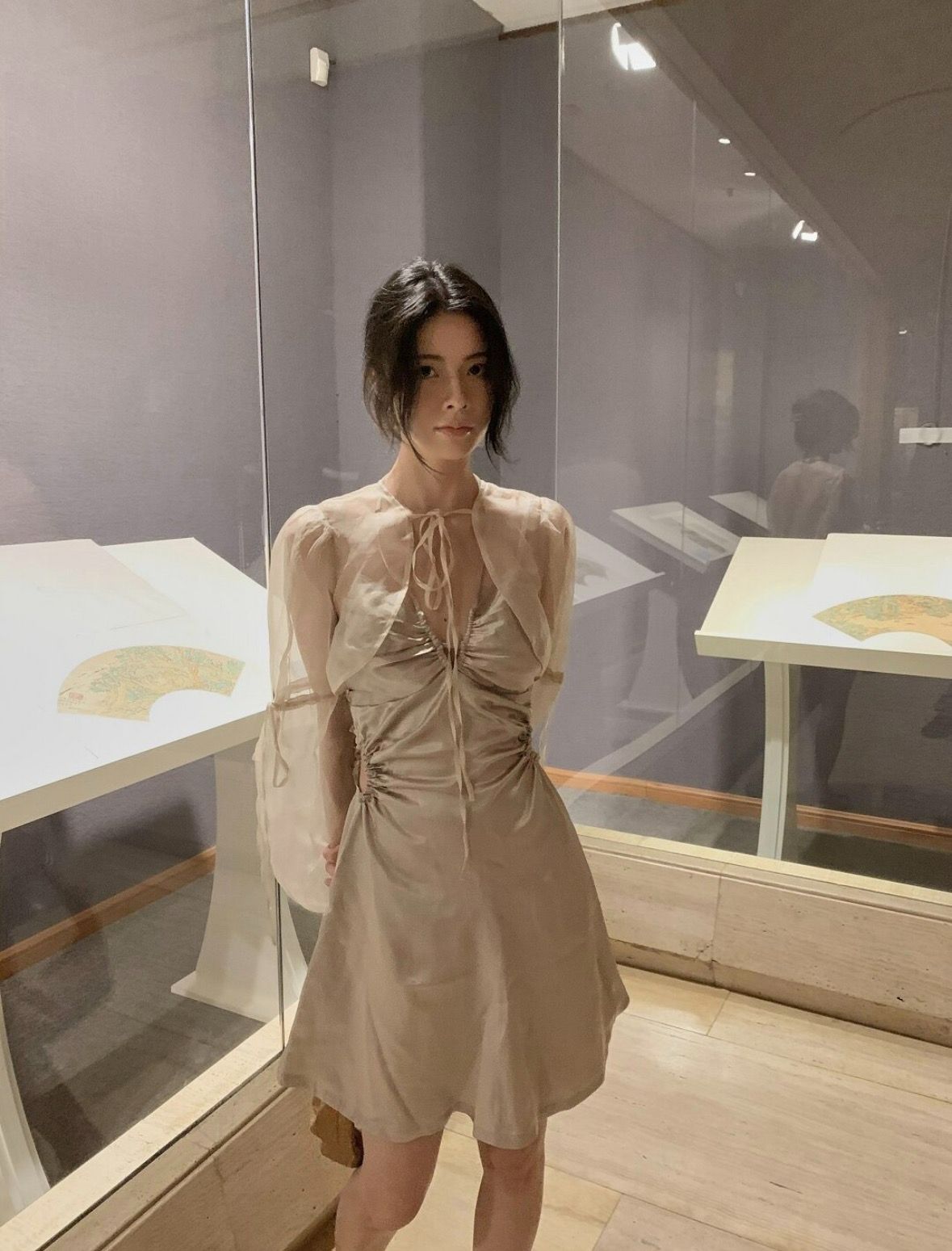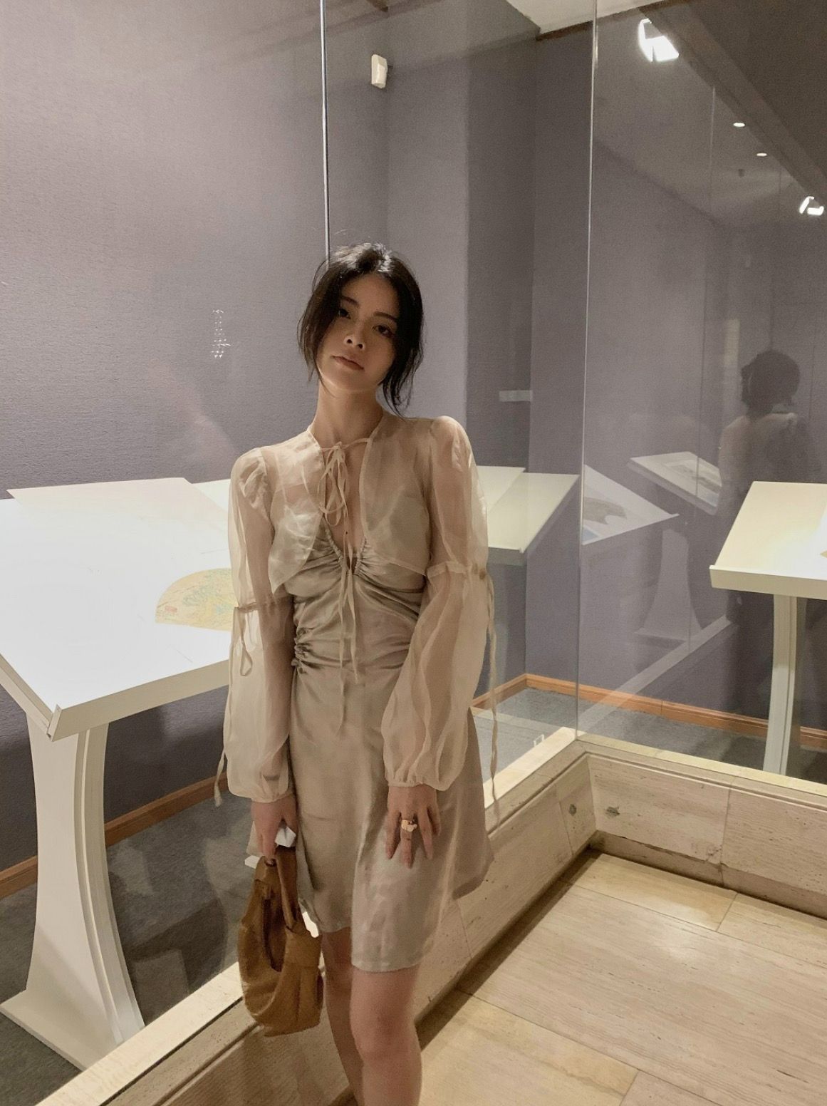 Adopting a round neck tie and micro bubble sleeve design, the organza comes with a semi transparent soft light filter, making it light and elegant when walking; The details of the cuff tie can be adjusted to fit various wearing styles. After tea dyeing, the organza is sandwashed to avoid stiff and pricking the skin, while retaining the transparency of the fabric itself. It has certain sun protection properties and styling, making it a highly adaptable "versatile add-on" in the series and a key item in the series.