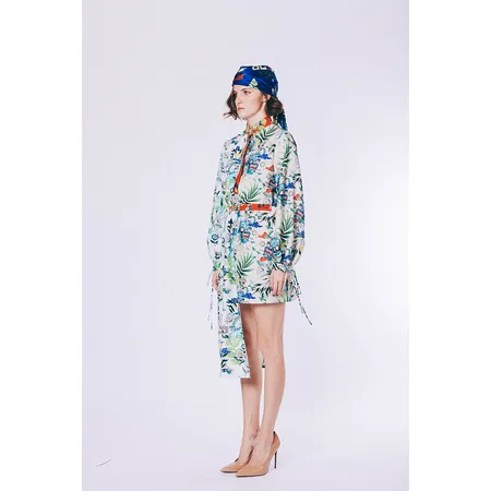 This shirt dress is made from polyester, the shirt style has blouson long sleeves and a flattering elastic waist to give definition to the waist. It is framed with oriental Thangka and floral patchwork patterned and asymmetric hem, which gives it a modish touch.