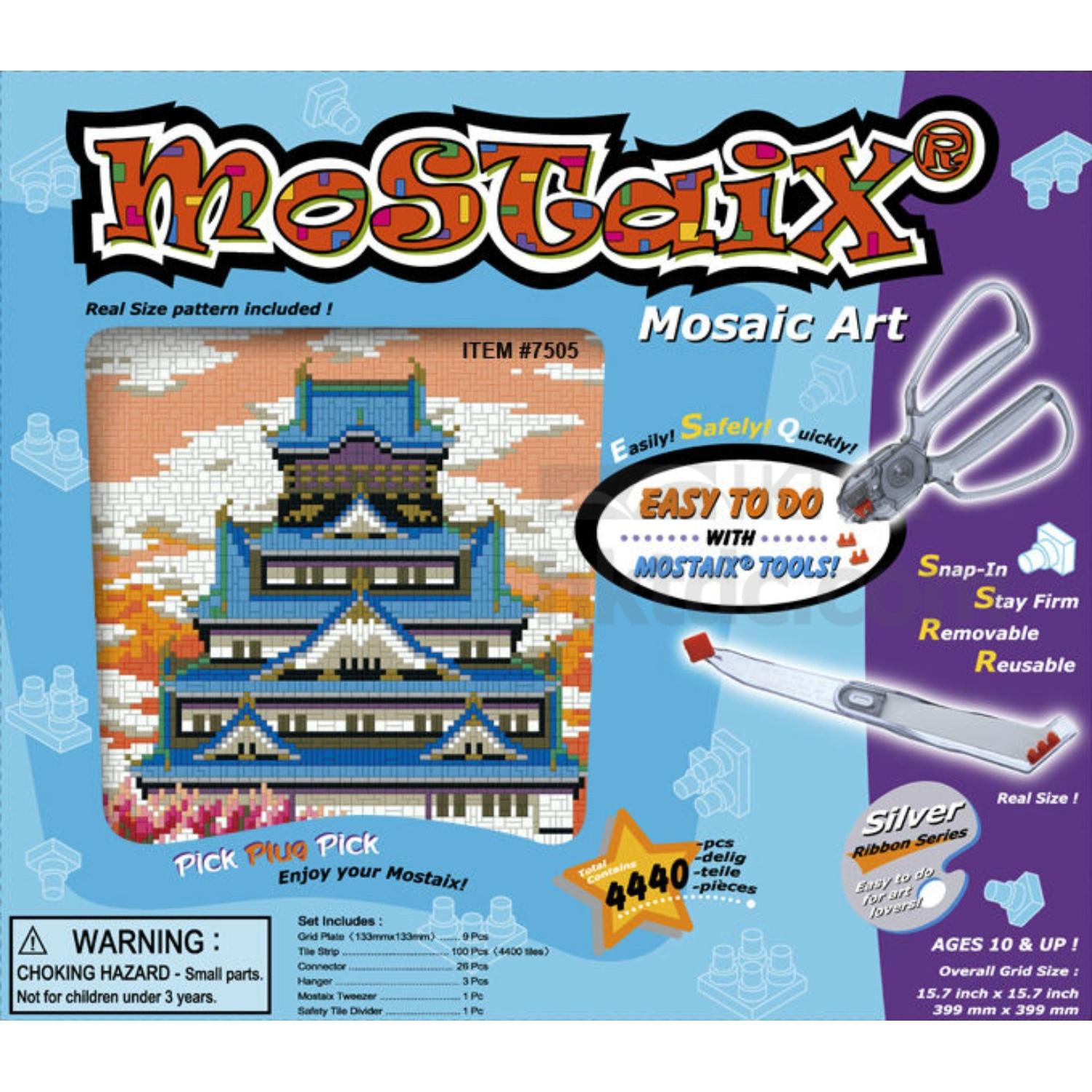 Each kit consists of 4,400 plastic tiles, 9 plastic girds, 36 connectors, 3 hangers, 1 Mostaix Tweezer, 1 Mostaix Safety Tile Divider, and a Real-Size Instruction.