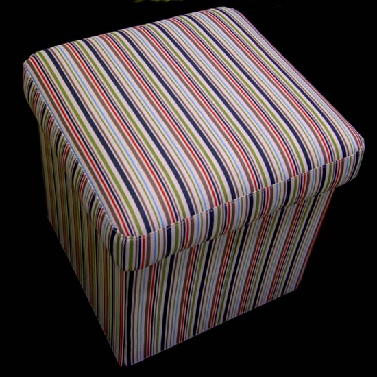 Featured is an ottoman storage stool coming in a cubic shape. The shell comes with striped patterns in a pleasing color combination. The cover can be lifted to provide room for storage.