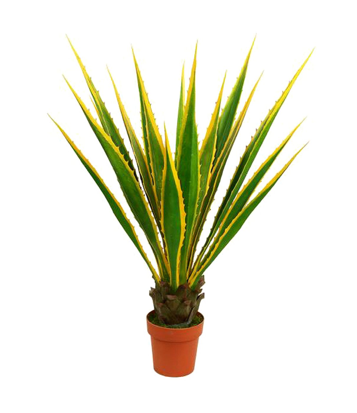 The outdoor artificial plant agave green gold edge UV against on a plastic base. This artificial plant is made of plastic which is weather and UV-resistant. It is a good display to your home and office.