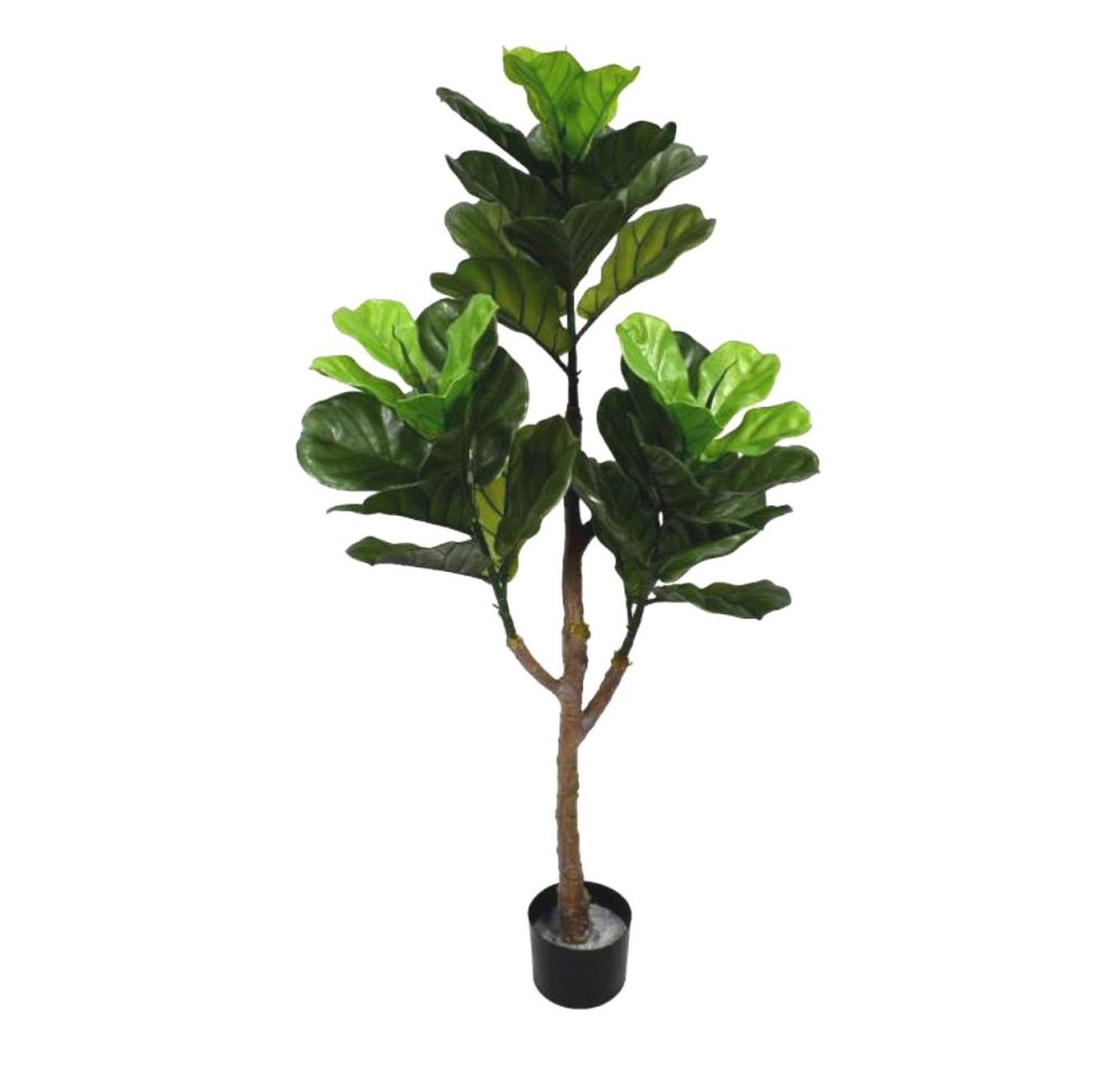 The artificial plant of the fiddle leaf fig tree on a plastic base.