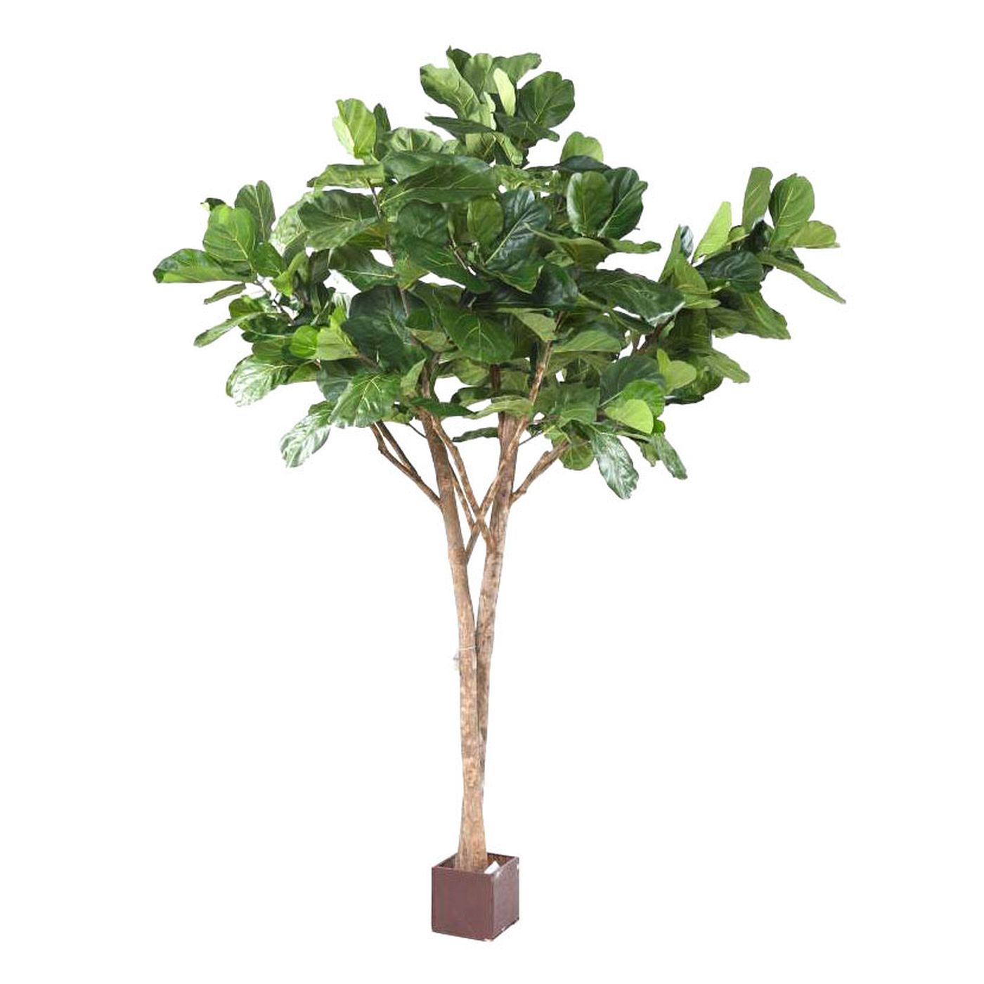 The artificial plant of the fiddle leaf tree on a plastic base.