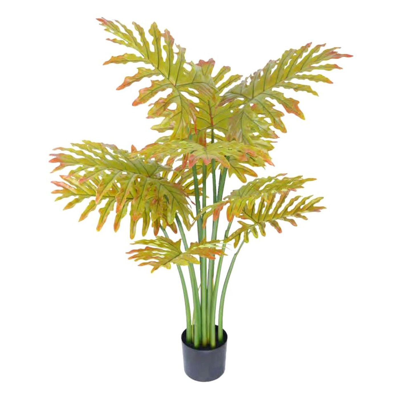 The artificial plant of the philodendron plant tree on a plastic base.