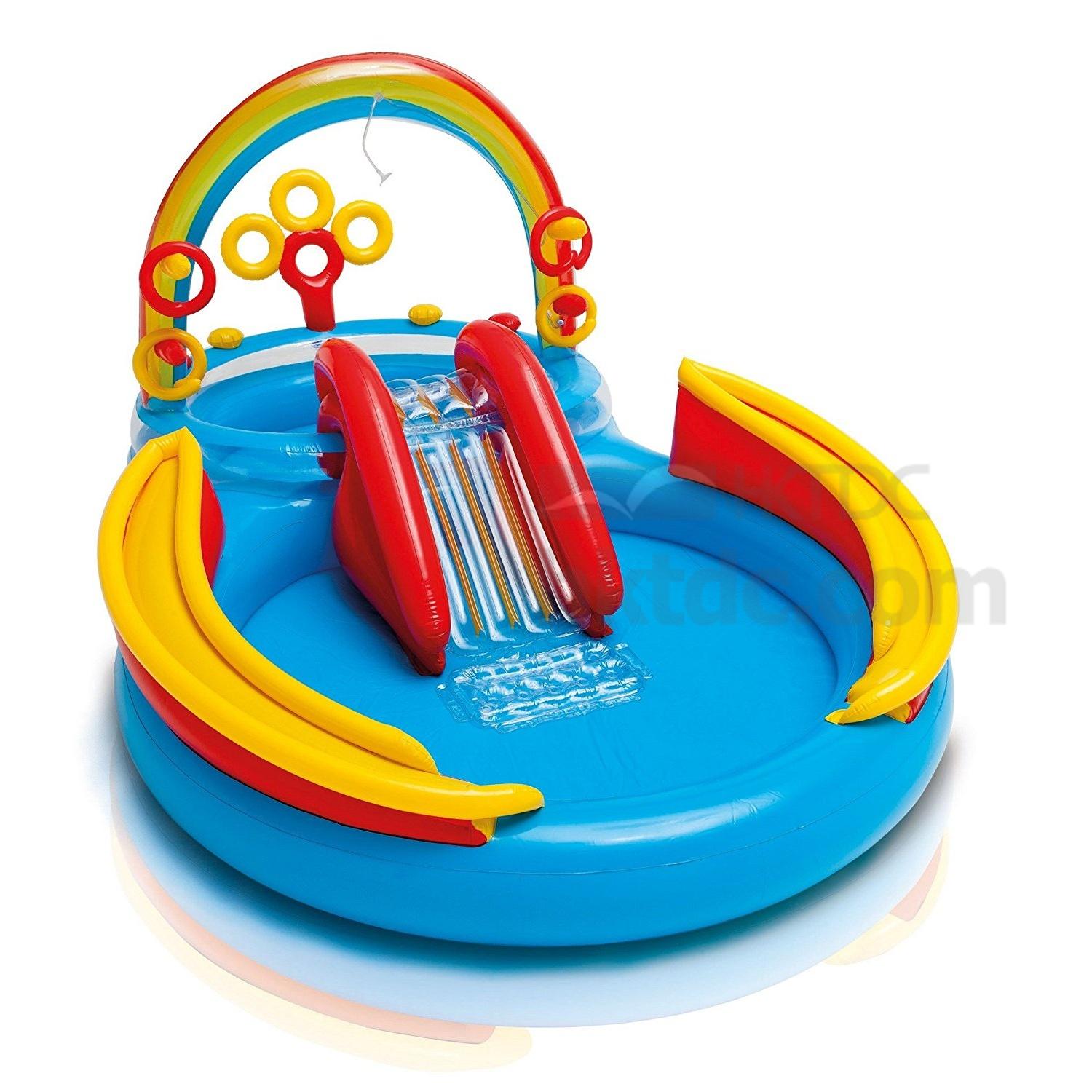 • Center includes water slide, wading pool, water sprayer, ring toss game (with 4 inflatable rings)