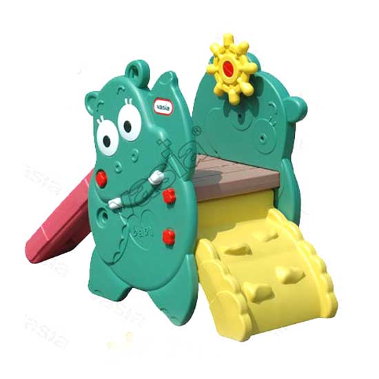 The outdoor playground equipment features an adorable hippo slide with a safe ladder to assist your little one to the top. It comes with a ship steering wheel for added fun. Durable and nicely designed, this outdoor play slide is an amazing feature for playgrounds and backyards.