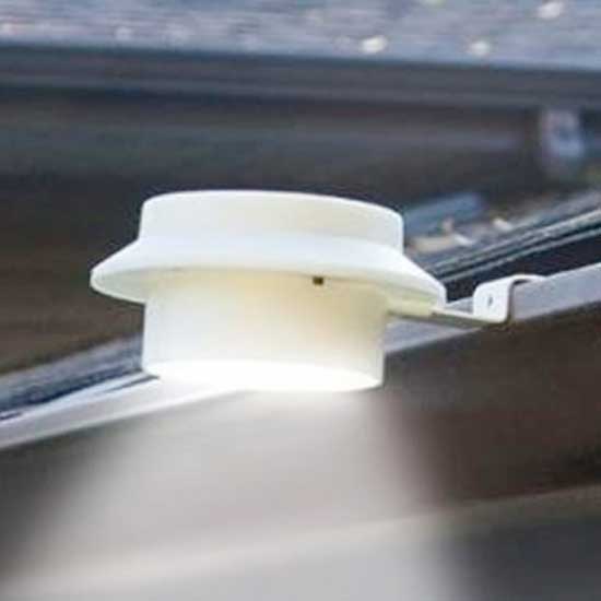 This outdoor solar LED light features a round aluminum body in a white finish. The LED light emits bright and uniform light with a wide beam angle. The motion-activated LED light dims to save energy when no people are nearby.