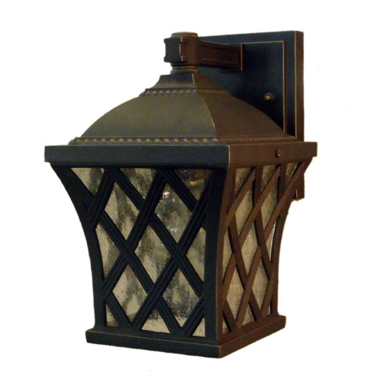 Pictured is a stylish wall lantern with a grid design. The frosted lampshade helps reduce unwanted direct glare. This outdoor wall lantern is a nice choice for lighting up the pathway.