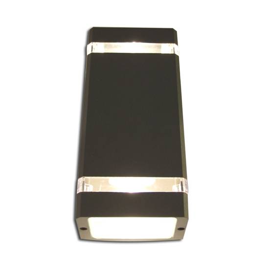 This is an outdoor wall lamp made with black rectangular box housing. The housing is made with 2 narrow transparent sections for light to penetrates out. The eye-catching outdoor wall lamp acts also a nice decoration.