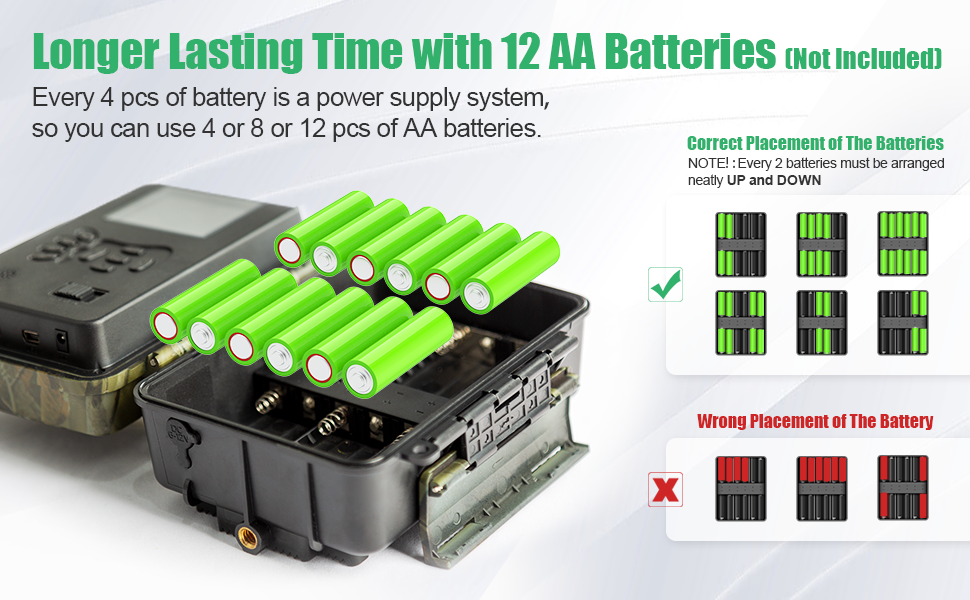 7.Support standard 5V-12V adapter(Max 12V) and 4AA/8AA/12AA batteries; 8AA/12AA recommend;