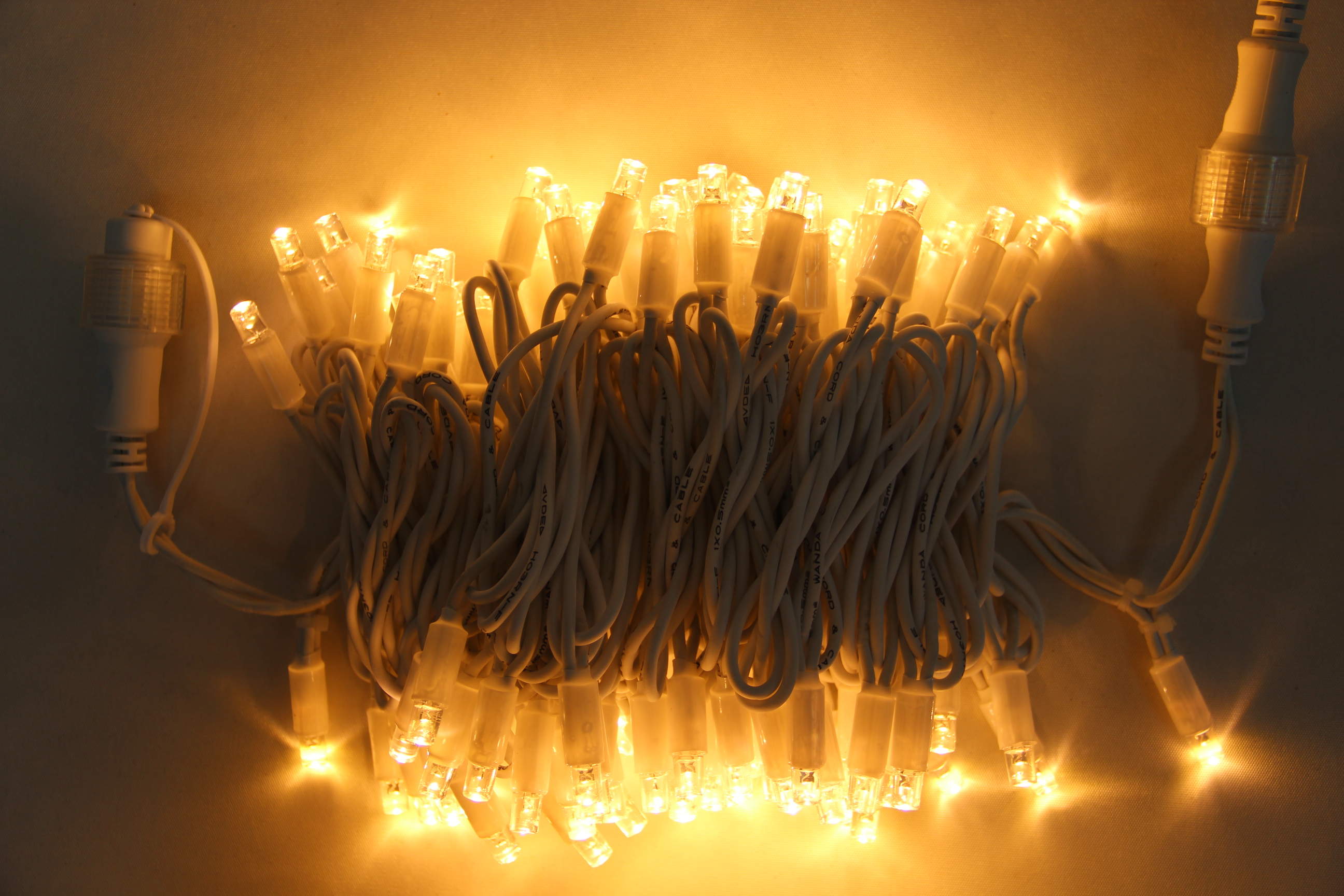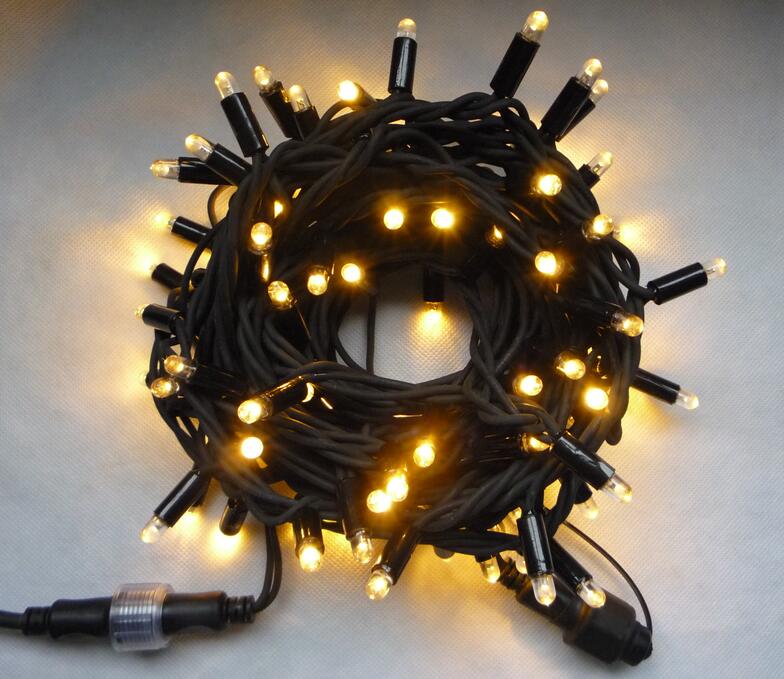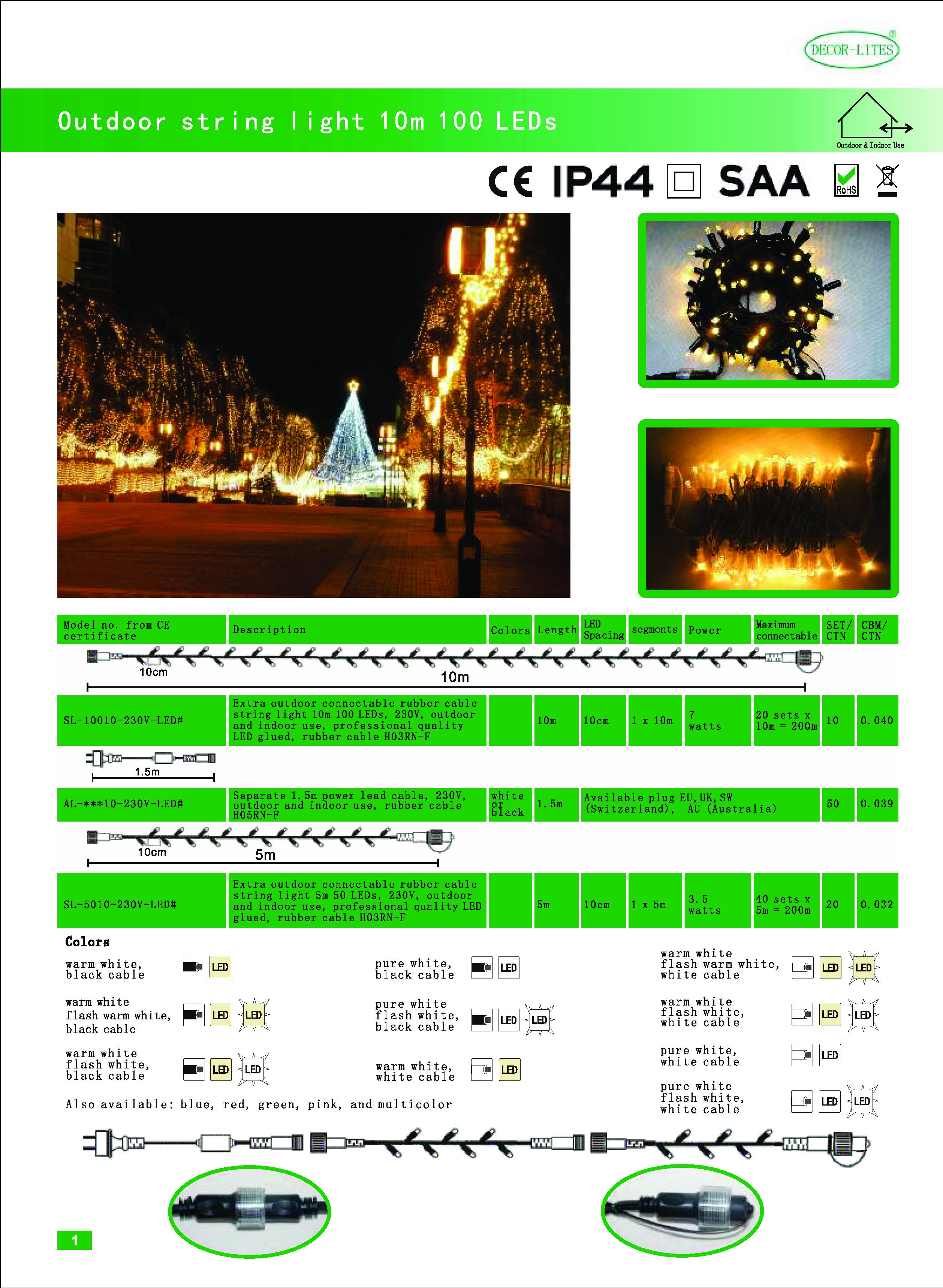 Outdoor connectable rubber cable LED string light, 230V, outdoor and indoor use, each LED glued waterproof with polycarbonate cap, 1.5m power lead cable, black cable, color box. multicolor = red, warm white, blue, green