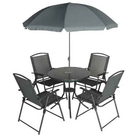 6 pcs outdoor furniture set. Steel frame, textilene seat fabric. polyester parasol. Each set into a master carton. 390 sets/40HQ.