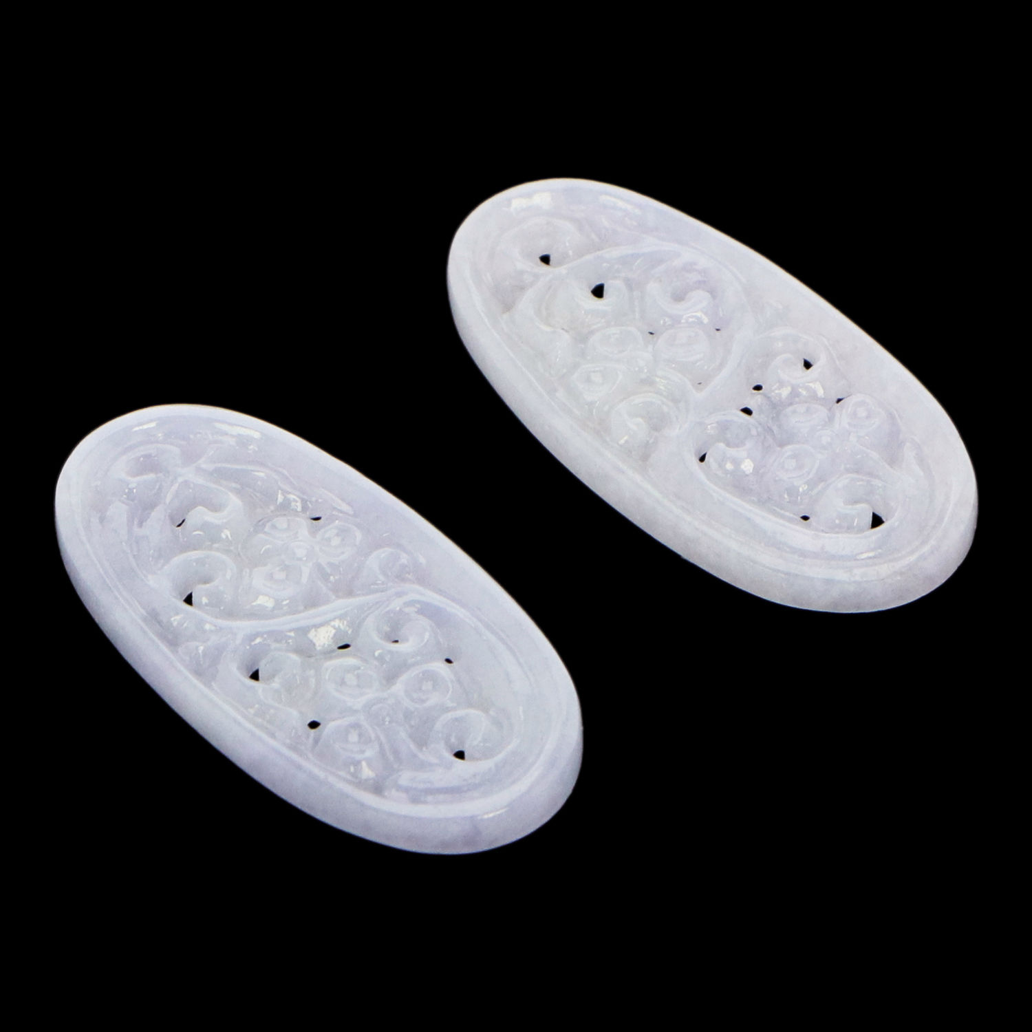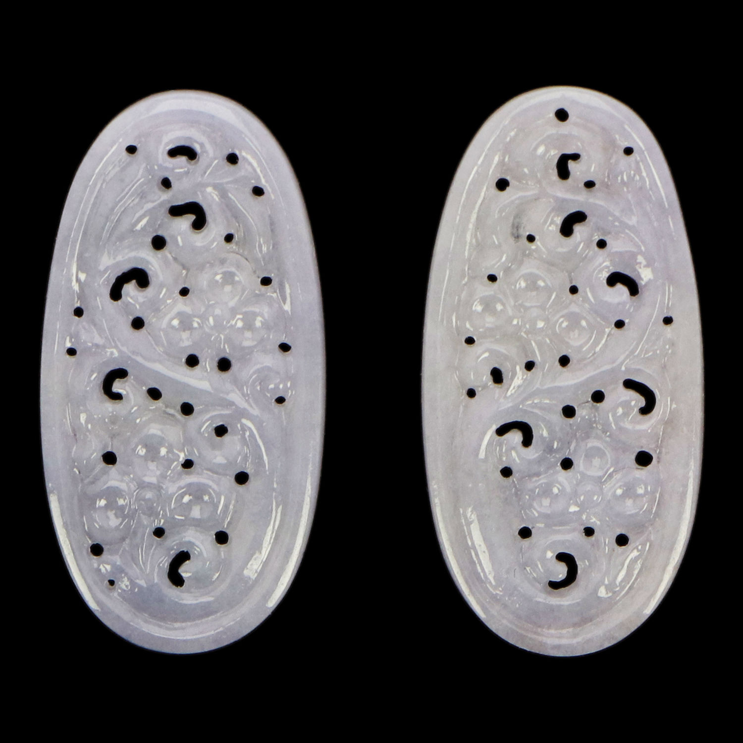 Handcrafted with natural lavender jadeite jade mined in Myanmar, these earrings come in an elongated, oval shape for a unique and antique appeal. Set within the beautifully shaped pair are intricate floral and swirl carvings that best reflect its exquisite craftsmanship. Refined and stunning, this number will elevate evening ensembles with an oriental and glamorous allure.