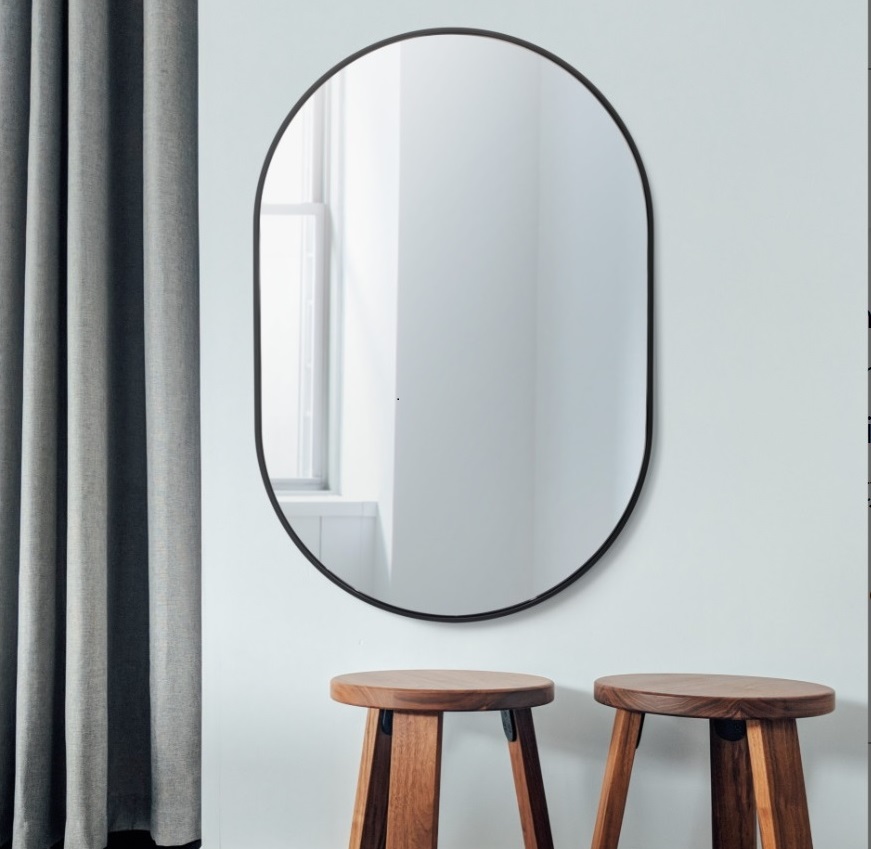 This minimalist oval-shaped flat mirror is a combination of utility and elegant design. It is good choice for any home style.