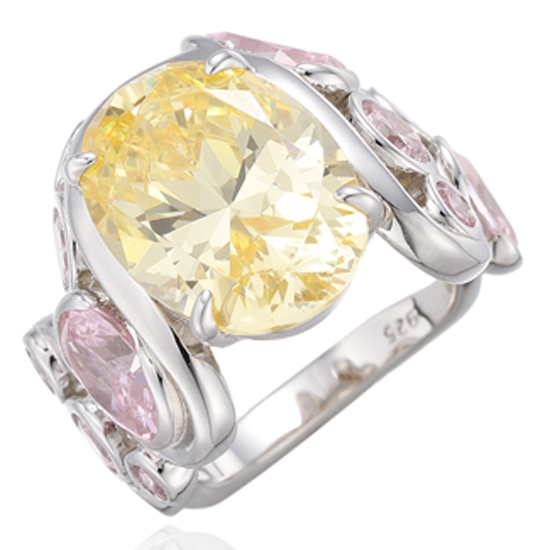 Oval Shape Diamond Yellow And Diamond Pink Cubic Zircon Rhodium Silver Ring