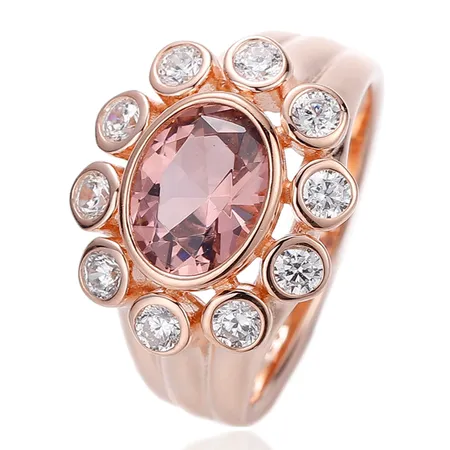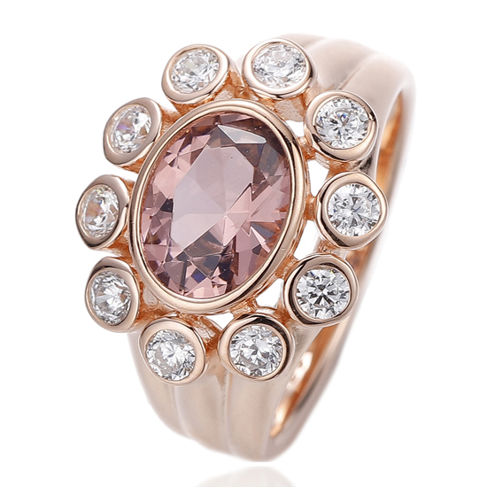 Oval Shape Morganite Nano And Round White Cubic Zircon Silver Ring With Rose Gold Plating