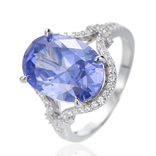 Oval Shape Tanzanite And Round White Cubic Zircon Rhodium Plating Silver Ring