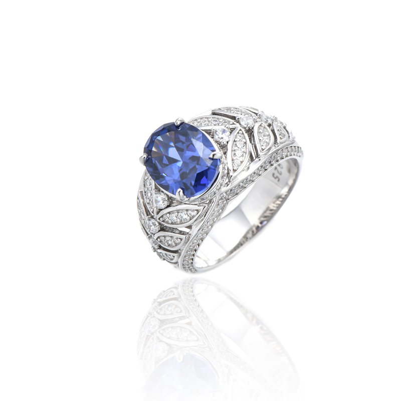 Oval Shape Tanzanite And Round White Cubic Zircon Rhodium Silver Ring