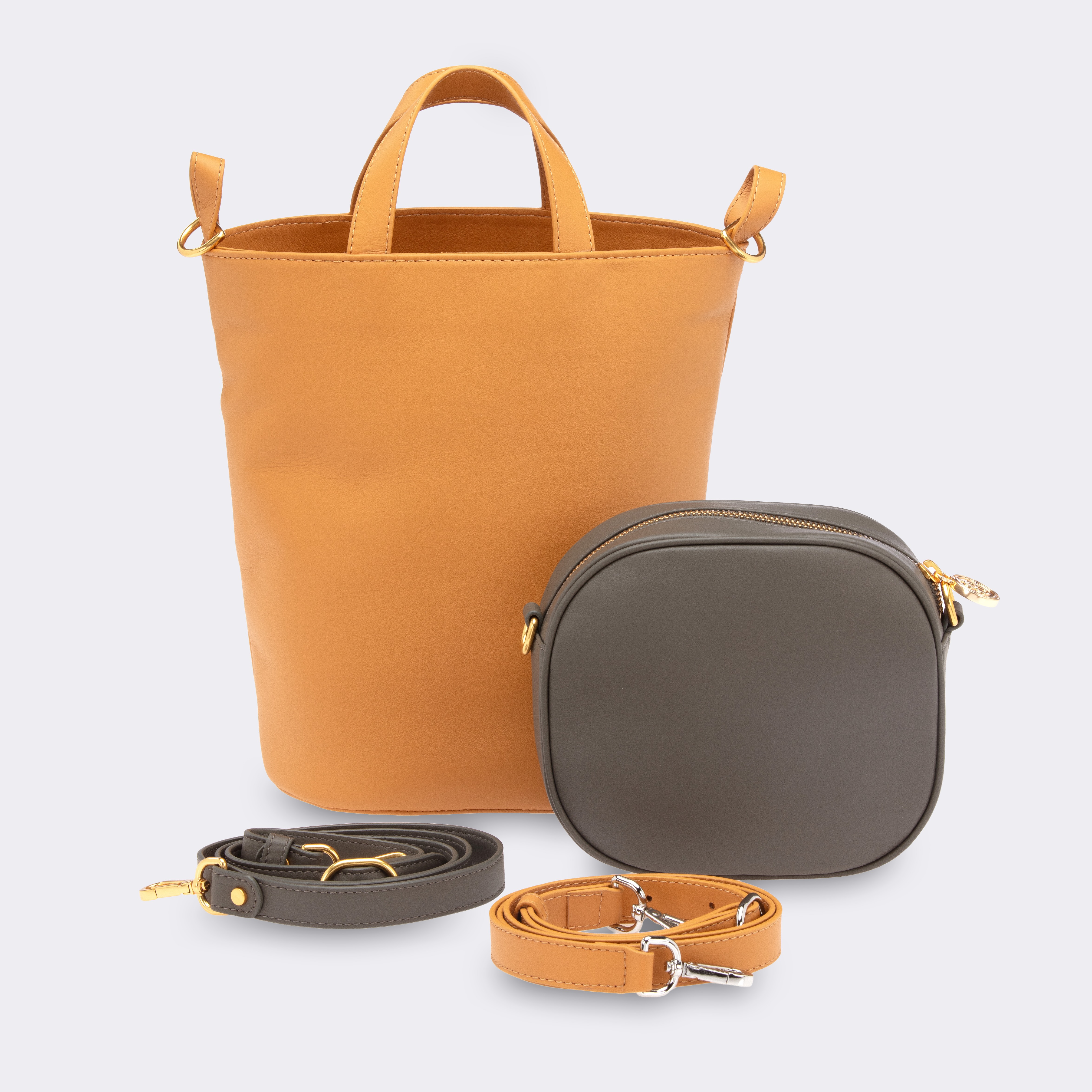 This bag is designed with inter changeable shoulder straps with the brand theme colours: light tan, olive grey and charcoal black. Exterior zip pocket. Cotton drill lining