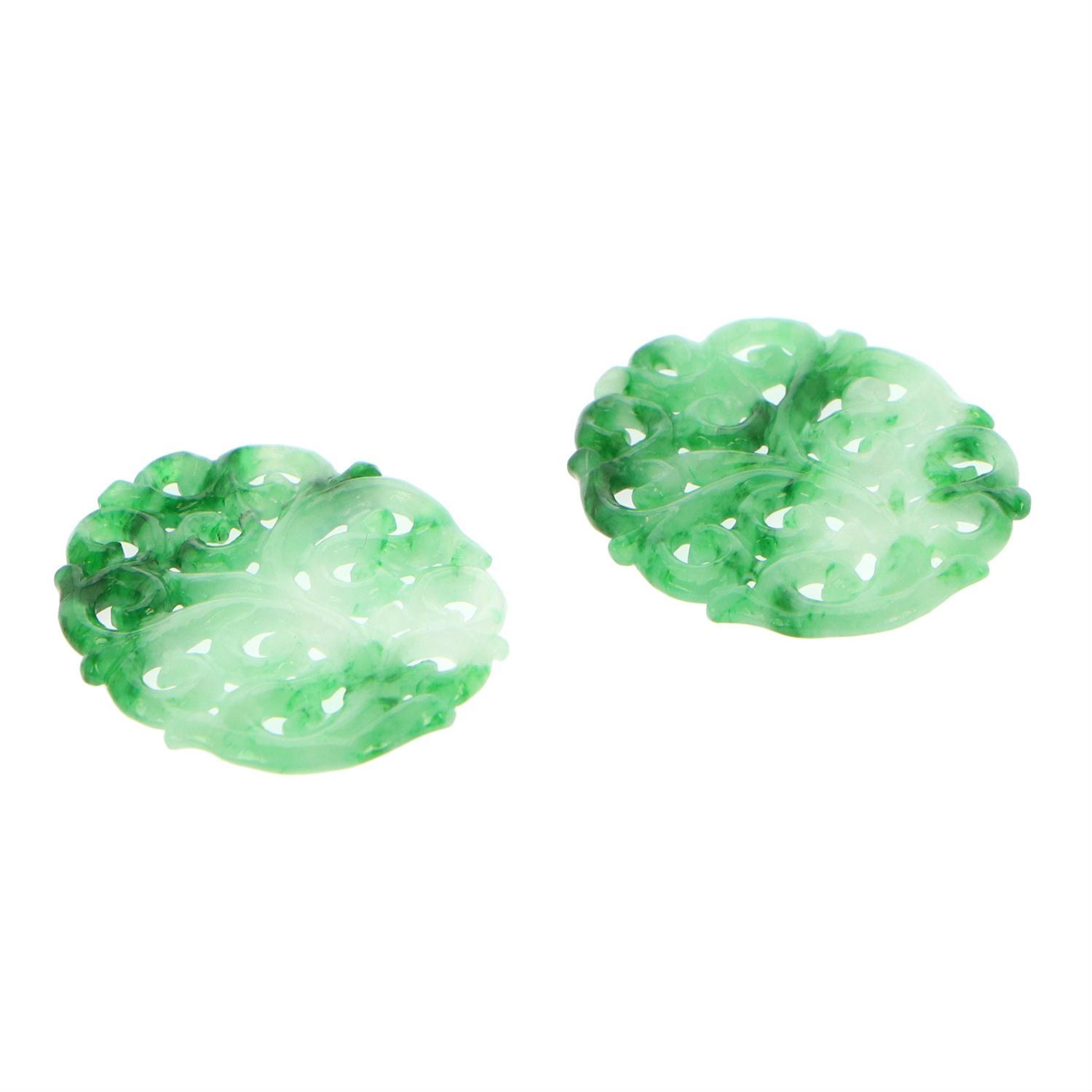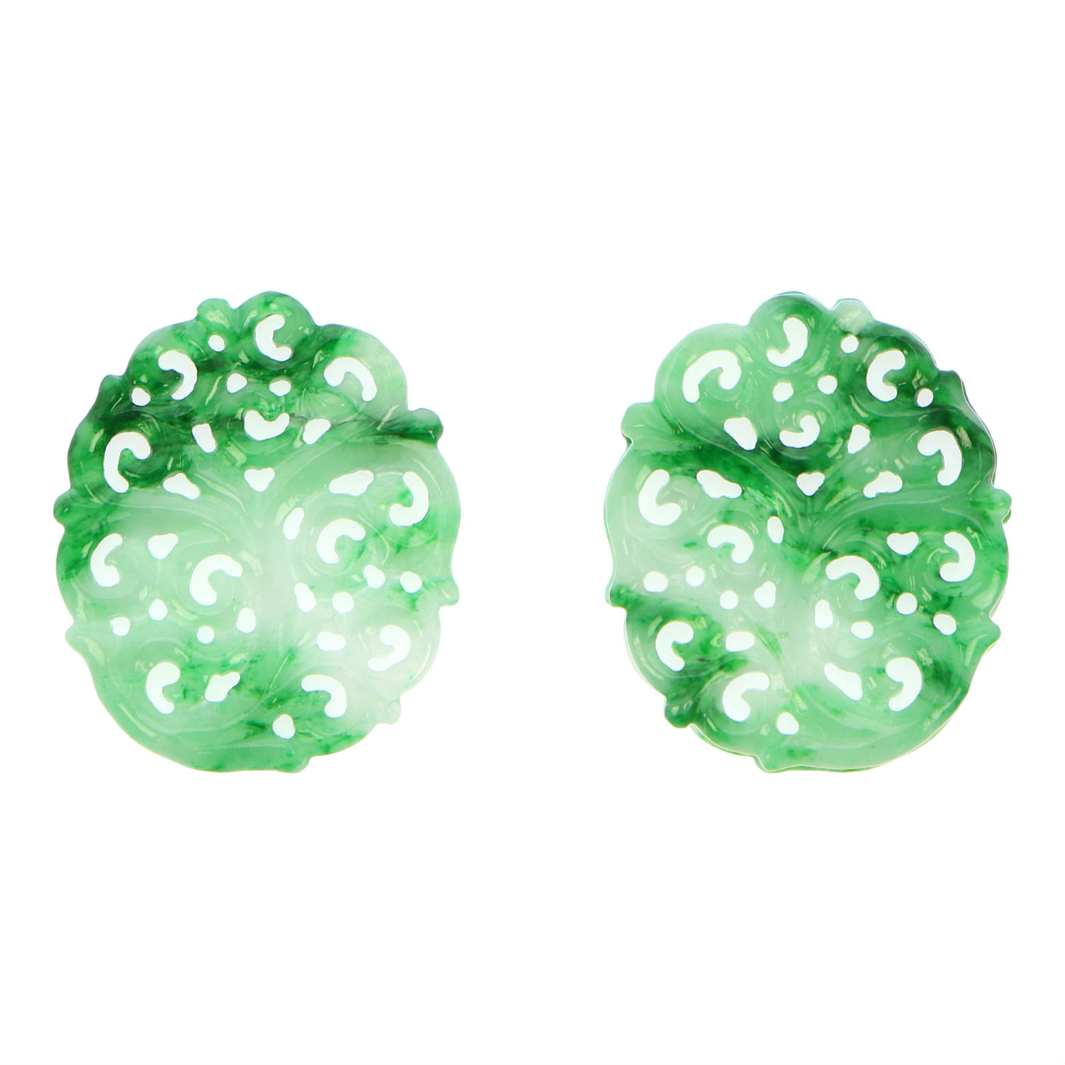 Seeming like a relic once worn by Chinese royals, this pair of green jadeite earrings presents a refined foliage cut-out design that best showcases its exquisite craftsmanship. The lustrous pair is carefully handcrafted in an oval, plate-like silhouette that lets its numerous natural hues shine. Wear your hair up to draw all attention to this feminine and captivating pair.
