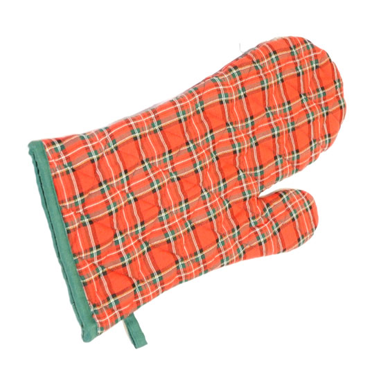 The oven glove is designed to be worn in the kitchen to protect the wearers' hands from being hurt. The glove features classic plaid patterns for a fashionable look. Featuring a blue rim, the glove is completed in 100% cotton construction.