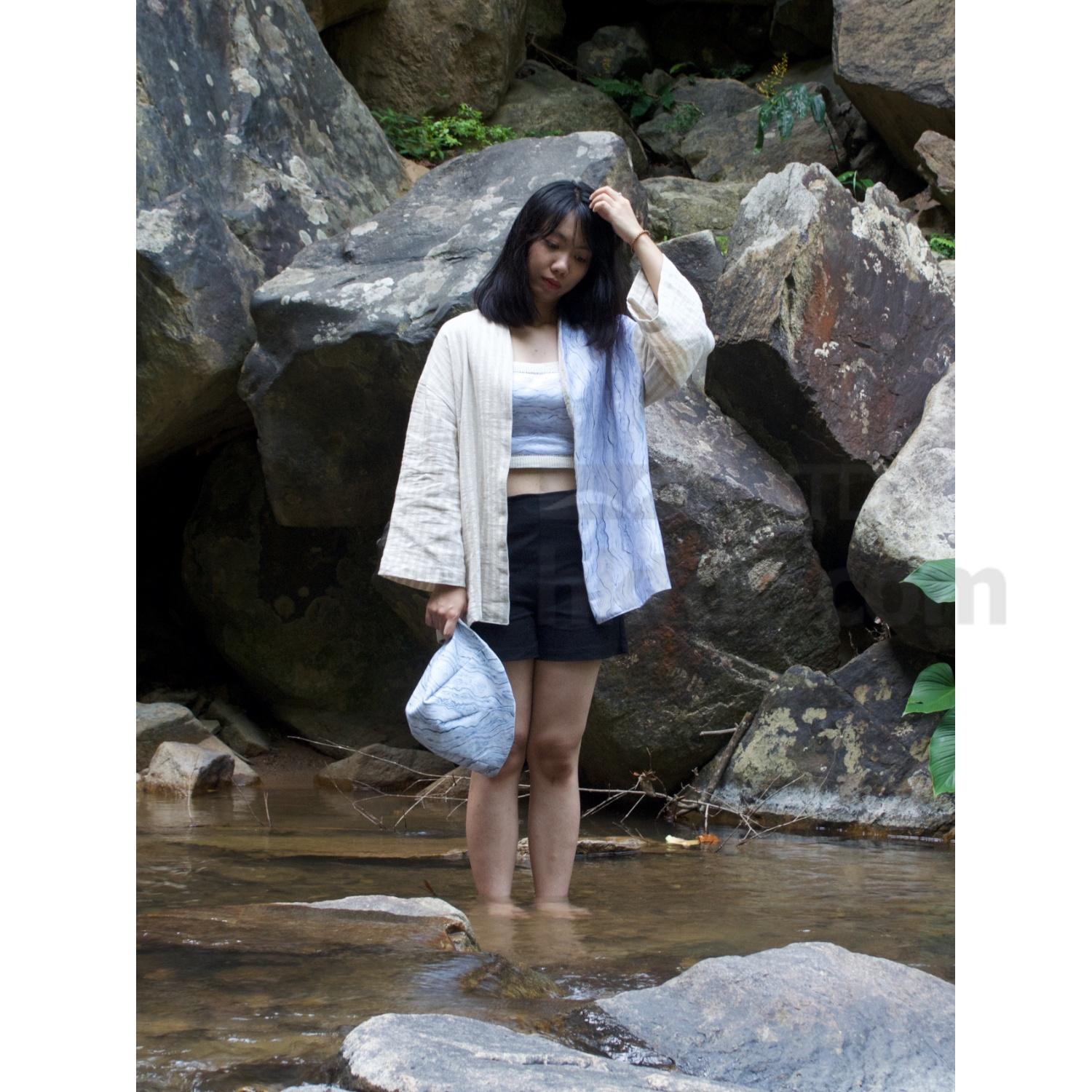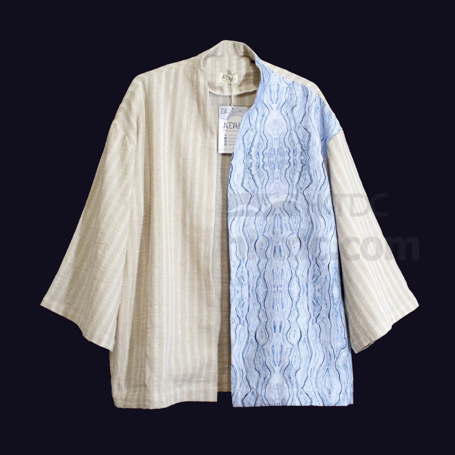 Ease into the sultry summer with this oversized jacket. Contouring your profile with a slightly oversized silhouette, the collarless jacket is marked for immediate attention with a breezy mix of tonal stripes and wave-like prints at its front panel. Outfitted with a pair of roomy sleeves, the handcrafted jacket boasts to be a no-fail partner with your fitted crop top.