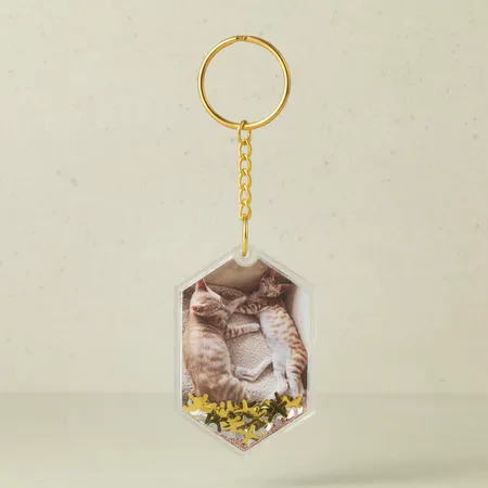 Photo water globe keychain that is perfect for displaying your favorite photo. Hexagon water globe that fits two petite photos, filled with water and shimmering glitter inside. Use it to organize your keys or as a decoration for your bag.