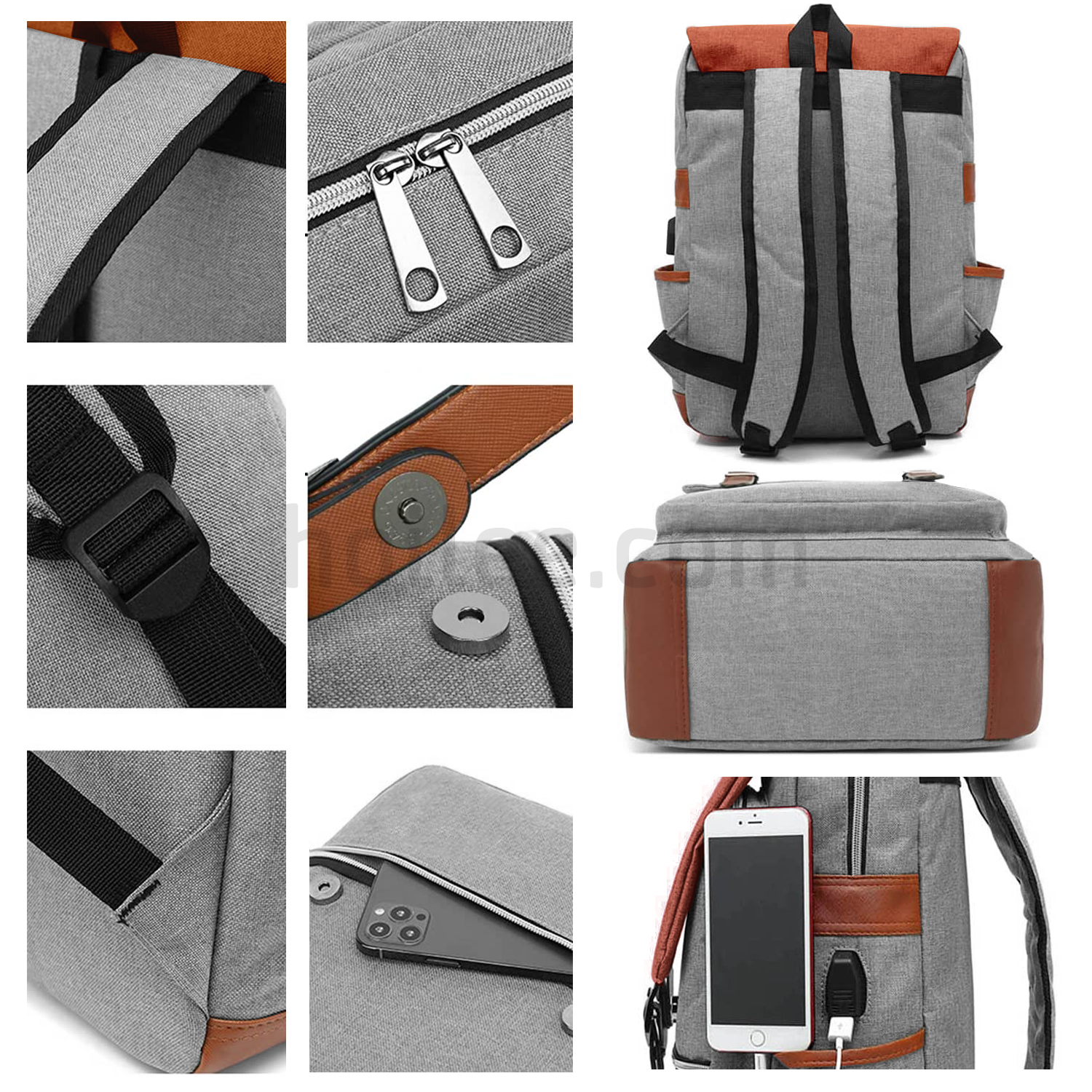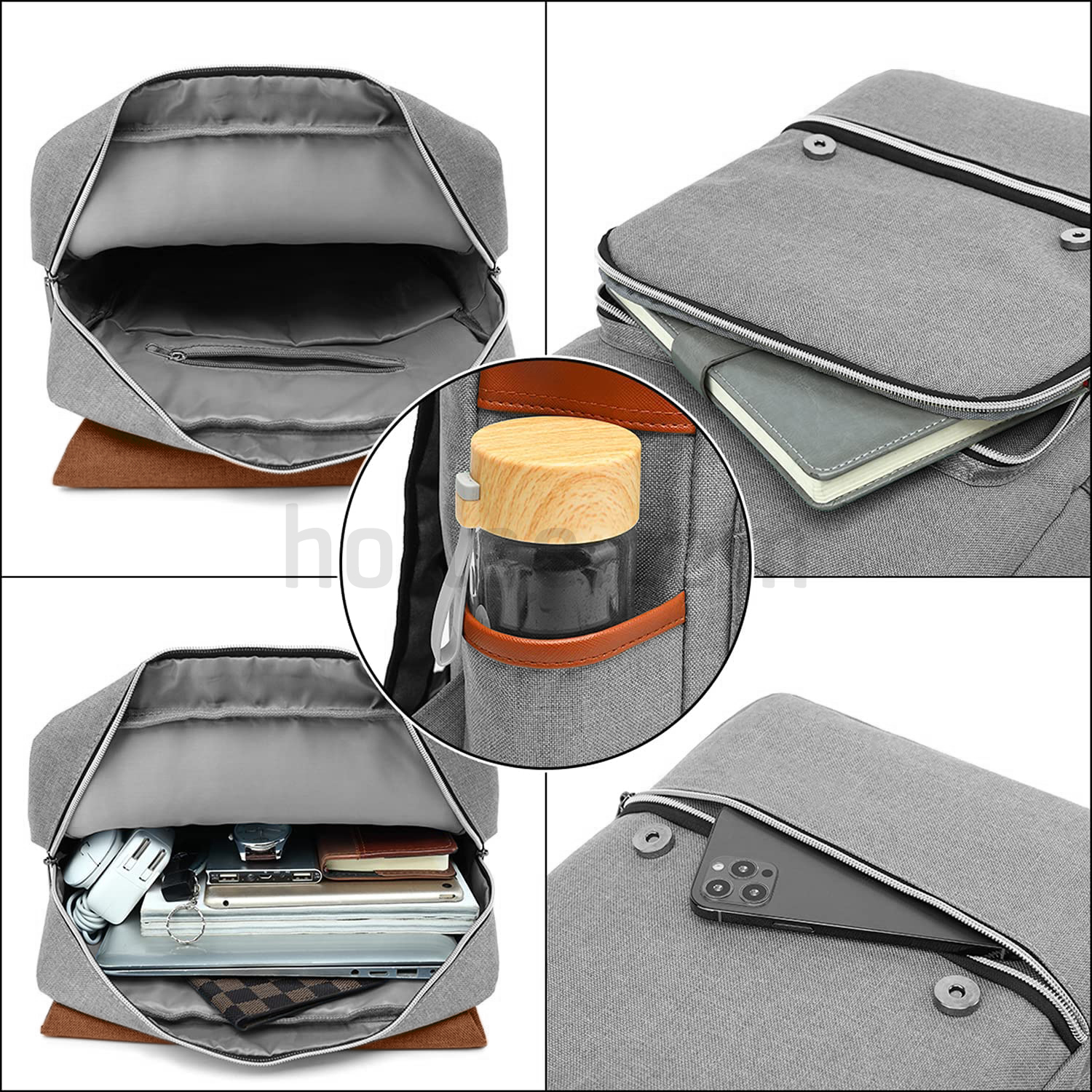 6 compartments, 1 main pocket with laptop sleeve large fits up to 15.6" laptop, clothes, books, purse, tablet and other daily needs, 2 front zip pocket under the portable fashionable flap handy access smartphone, earphone, magazine, tablet, and other carry-on stuff, one mesh pouch inside for power bank which can charge your phone on the go, one bottle pocket each side for drink bottle and umbrella.