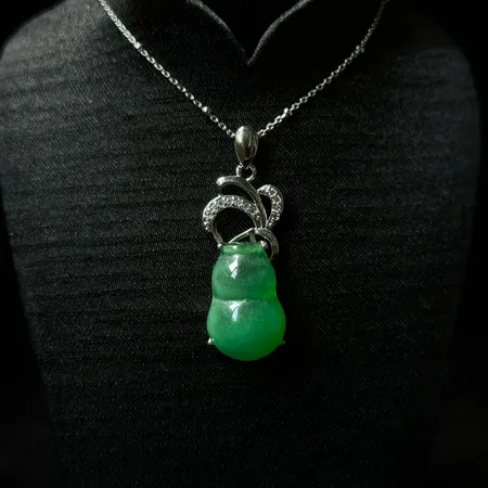 This charming necklace showcases a central jadeite carving sculpted into the auspicious, double-lobed shape of a gourd or 'hulu'. The stone exhibits a smooth, rounded form and a vibrant green color.
