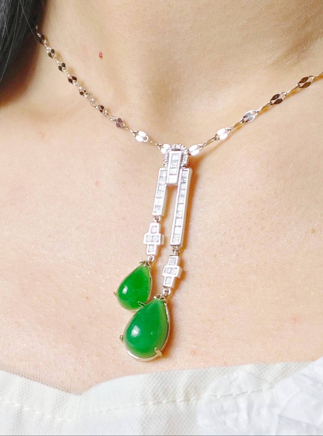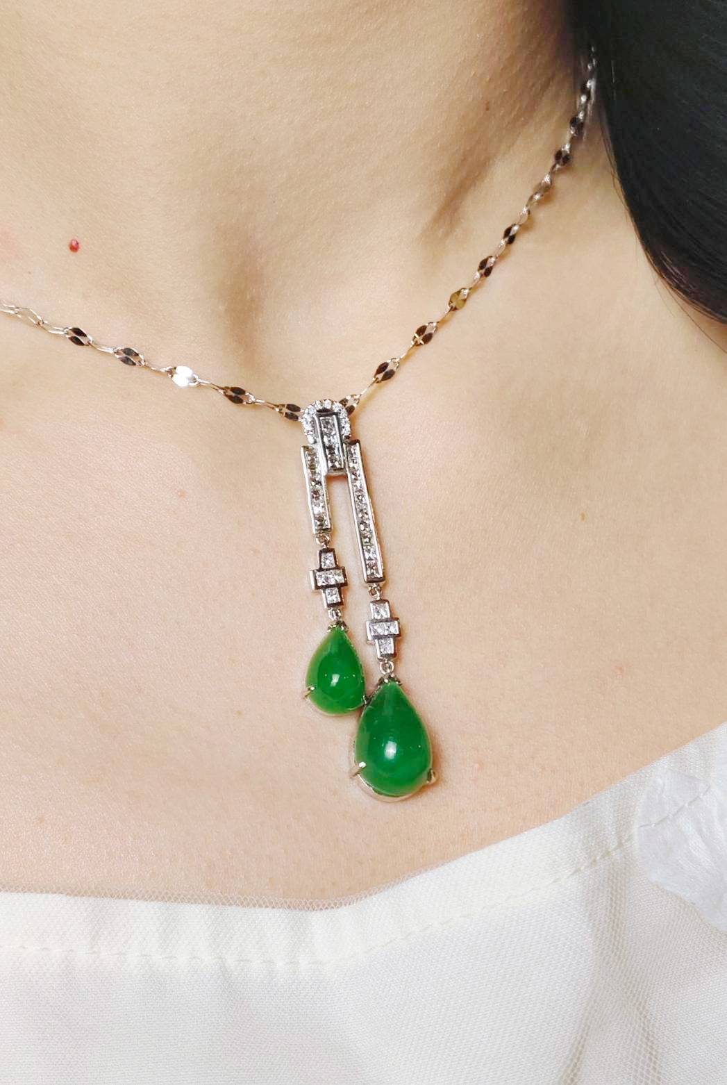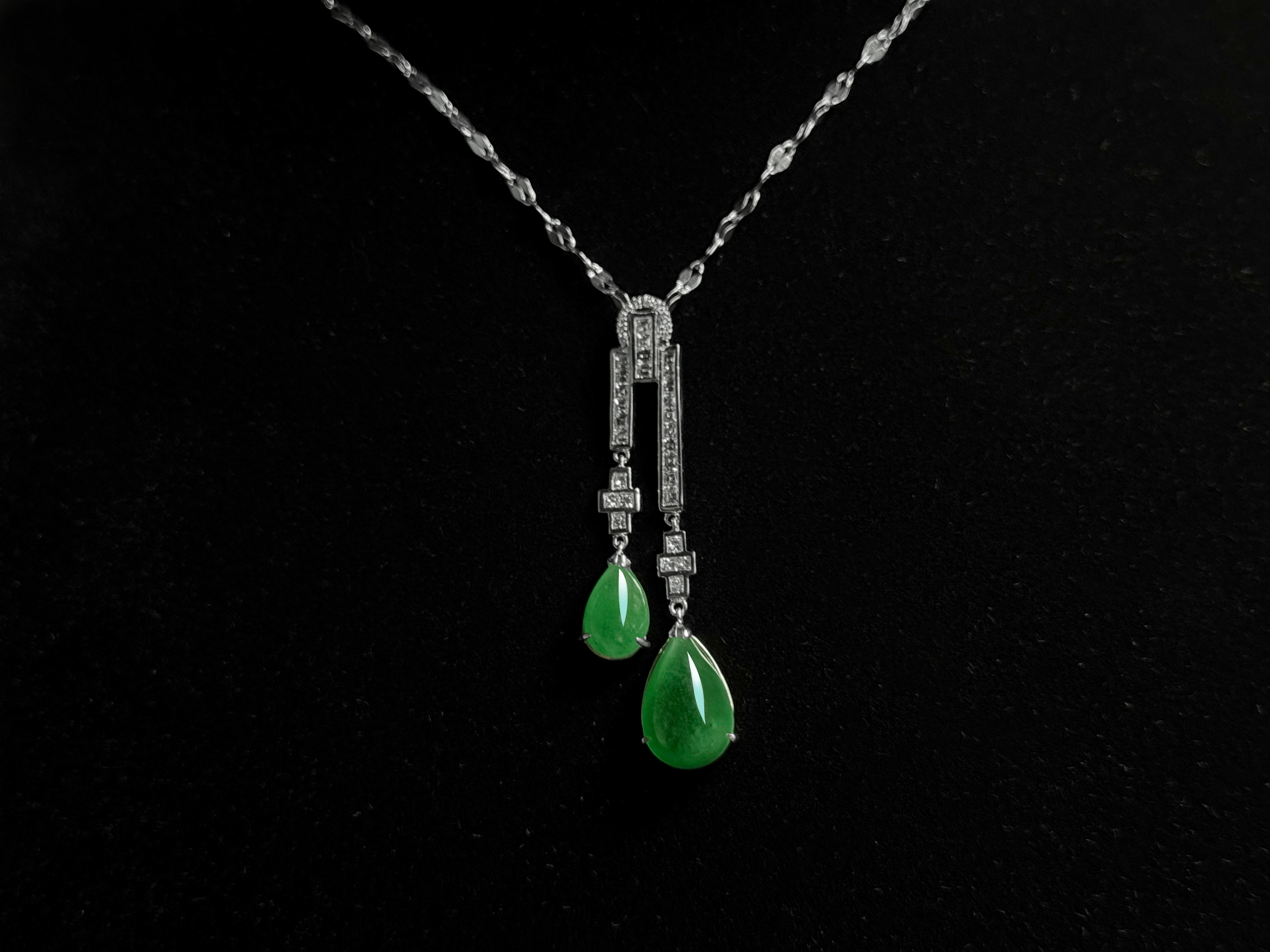 The upper section features a geometric setting composed of rectangular and trapezoidal lines, with this vertical structure meticulously paved with tiny, brilliant accent stones. Suspended below are two teardrop-shaped green jadeite cabochons of different sizes—one large and full, the other small and delicate—whose smooth curves contrast with the sharp geometric lines above. The overall design is unique and layered, creating a classic luxurious yet modern draped beauty.