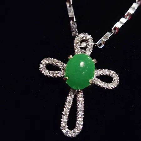 This necklace features a unique and graceful cross-shaped pendant as its main element. At the center is a smooth, round oval green jadeite cabochon, whose rich color forms the focal point.