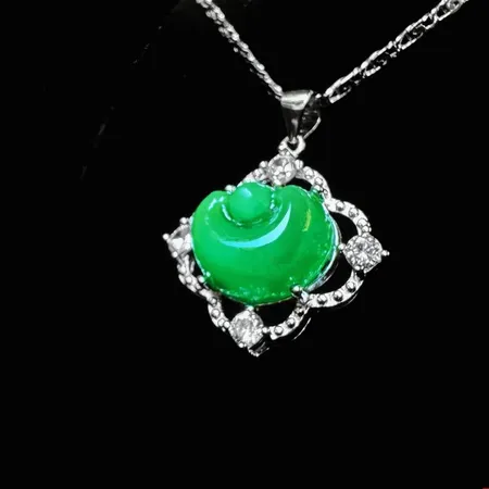 This elegant pendant necklace features a uniquely carved green jade centerpiece. The jade is a vivid, translucent green with a high polish, and its form resembles a traditional artistic motif, possibly a Ruyi or a symbolic knot, suggesting good fortune and wishes.