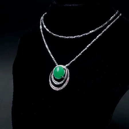 This elegant pendant necklace features a contemporary and dynamic design. The centerpiece is a smooth, highly polished oval-shaped cabochon of vibrant green jadeite. This central jadeite stone is securely set, exhibiting a luminous color and beautiful translucency.
