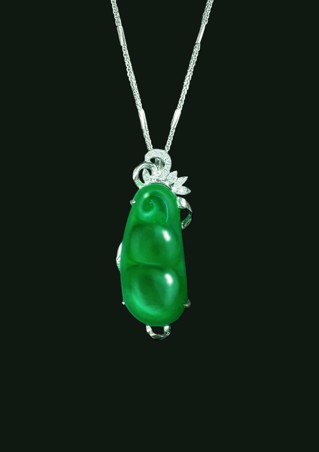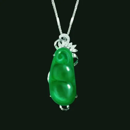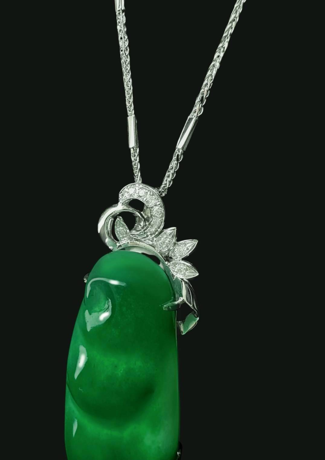This magnificent pendant necklace features a large, carved jadeite piece, shaped like the highly auspicious "Fu Dou" or green bean pod, which symbolizes prosperity and fertility. The jadeite exhibits a deep, vibrant green color and a smooth, rounded surface, showcasing its high quality.