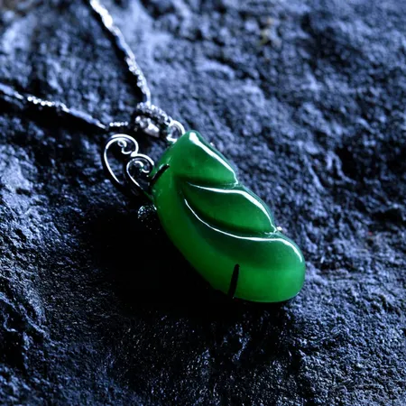 This graceful pendant necklace features a natural and highly detailed design. The centerpiece is a smooth, carved piece of vibrant green jadeite shaped like a leaf. The jadeite exhibits deep, rich color and a high polish, with naturalistic lines carved into the surface to depict the leaf's veins.