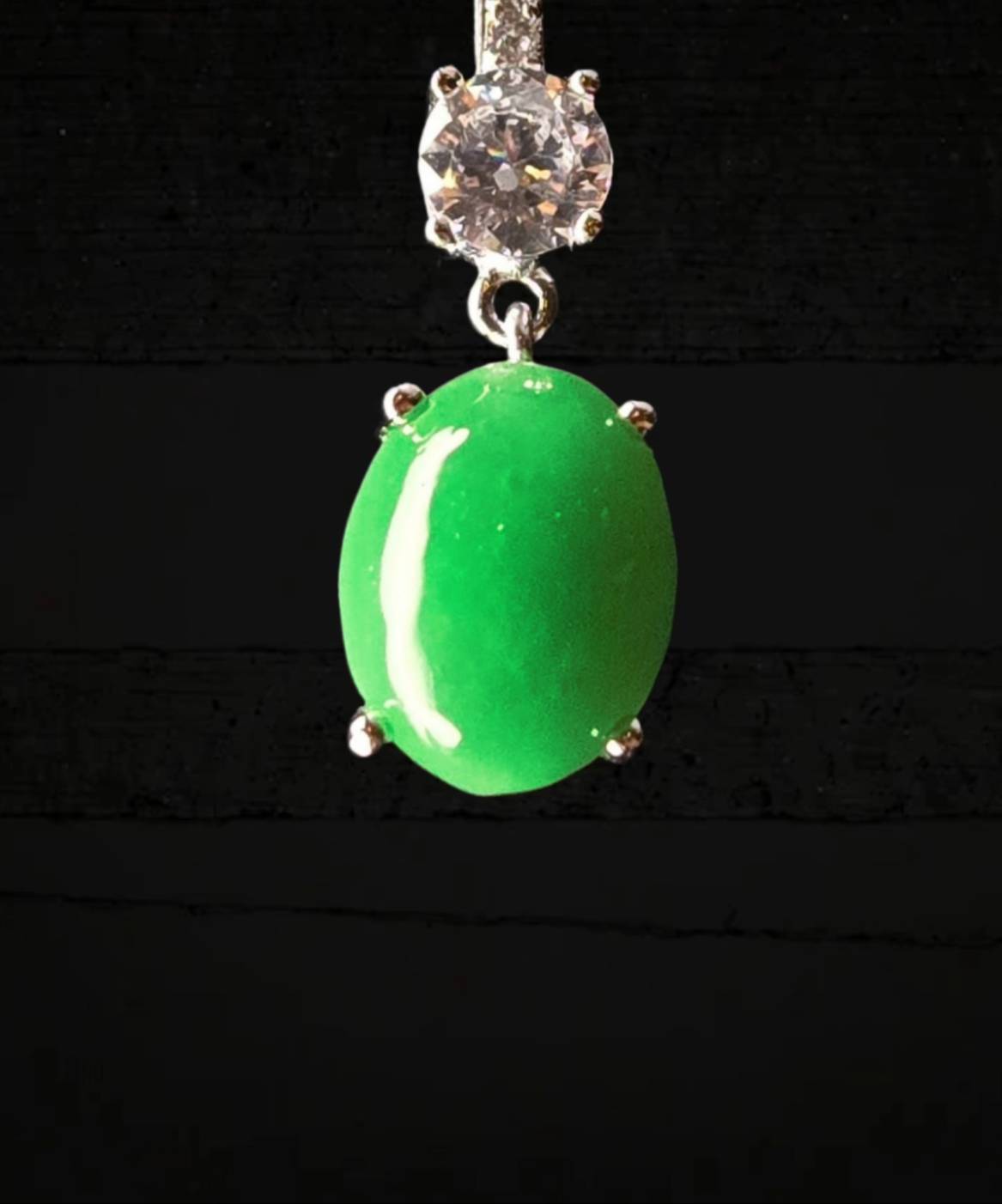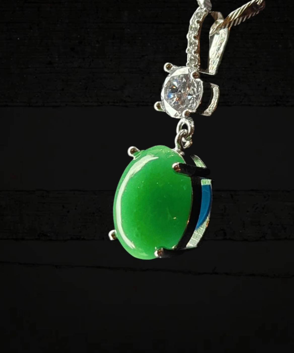 This necklace highlights the natural beauty of jadeite through a minimalist and elegant design. The centerpiece is a smooth, full oval jadeite stone, exhibiting a luscious, vibrant emerald-green color. Its bright luster resembles a crystal-clear dewdrop, radiating life and vitality. Above the jadeite, a polished bail adorned with brilliant gemstones connects the pendant, with clean, graceful lines that perfectly frame the main stone. The overall design is refined and fluid, paired with an elegant chain. Worn around the neck, this piece beautifully conveys the wearer's fresh, sophisticated demeanor and appreciation for classic jewelry.
