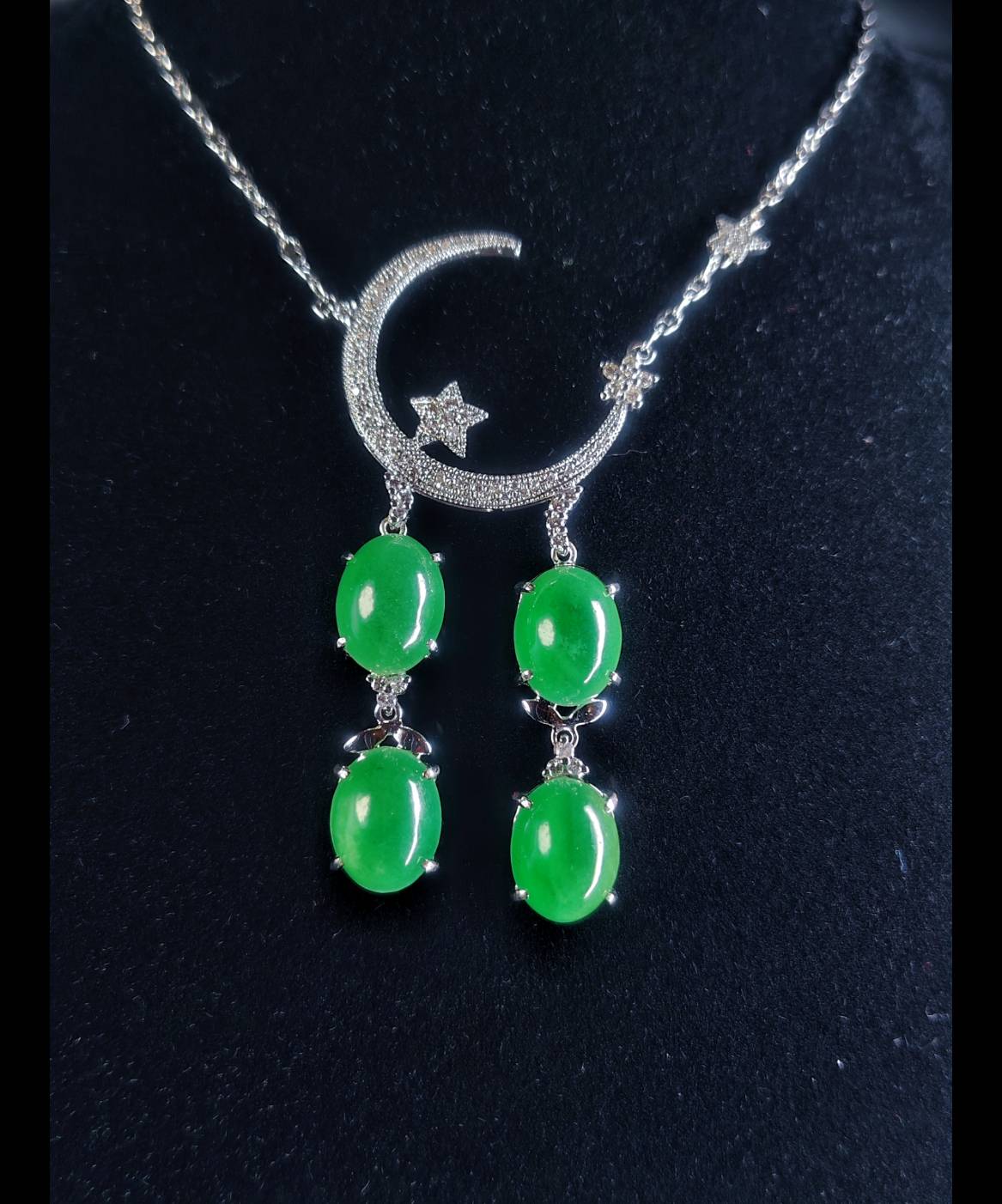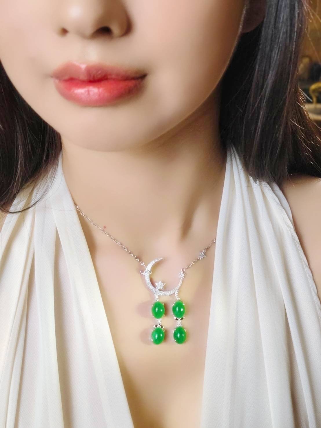 This necklace elegantly merges the romance of the night sky with the classic beauty of jadeite. The upper pendant features a crescent moon and stars gracefully set with brilliant small gemstones, radiating a refined silvery light. Suspended below are four full, polished jadeite cabochons. Their vibrant emerald-green color and smooth, translucent texture resemble green starlight descending from the heavens. The jadeite stones sway gently with movement, adding a dynamic vitality. This piece embodies a dreamy, poetic design, showcasing the wearer's distinctive fashion sense and gentle, sophisticated demeanor.