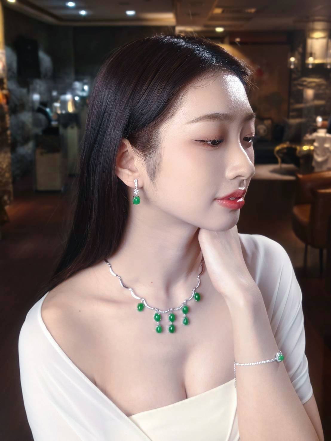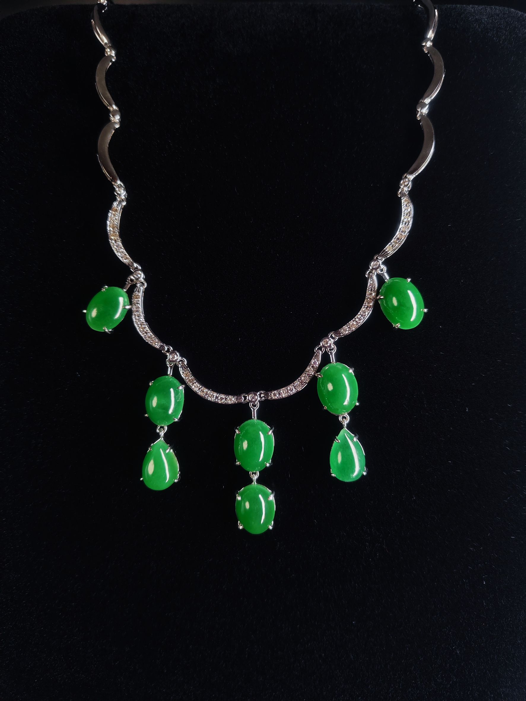 This necklace is a magnificent and elegant piece of neck art. It features a cascading design, with eight full, polished jadeite stones suspended at the center, presented in both oval and pear shapes. These jadeite stones display a rich, uniform emerald-green color and a lustrous sheen, resembling a fresh cluster of grapes. The main links of the necklace are formed by graceful wavy segments, delicately accented with brilliant small gemstones, skillfully connecting and supporting each jadeite stone. The fluid metalwork combined with the warm jadeite gives the necklace an alluring sense of movement, ensuring the wearer radiates sophisticated elegance and captivating charm.