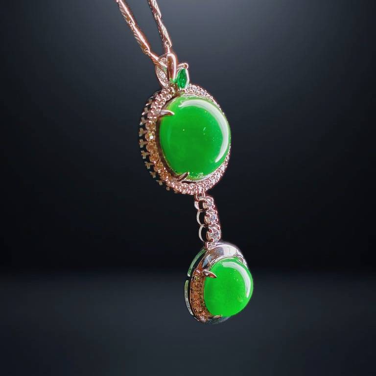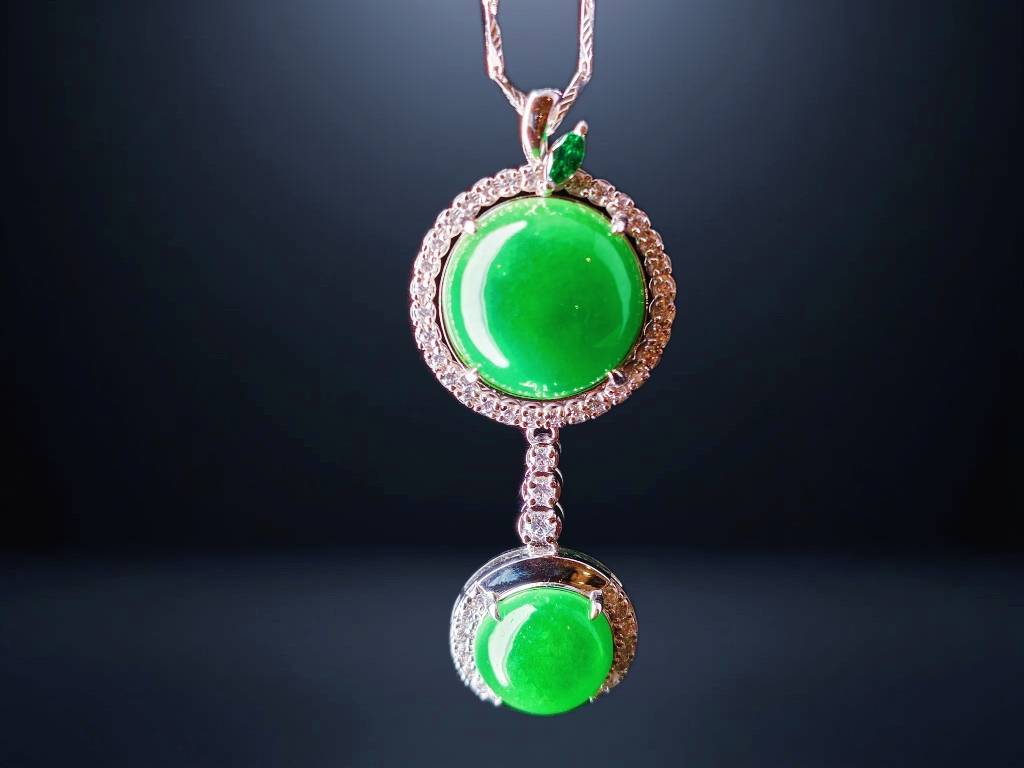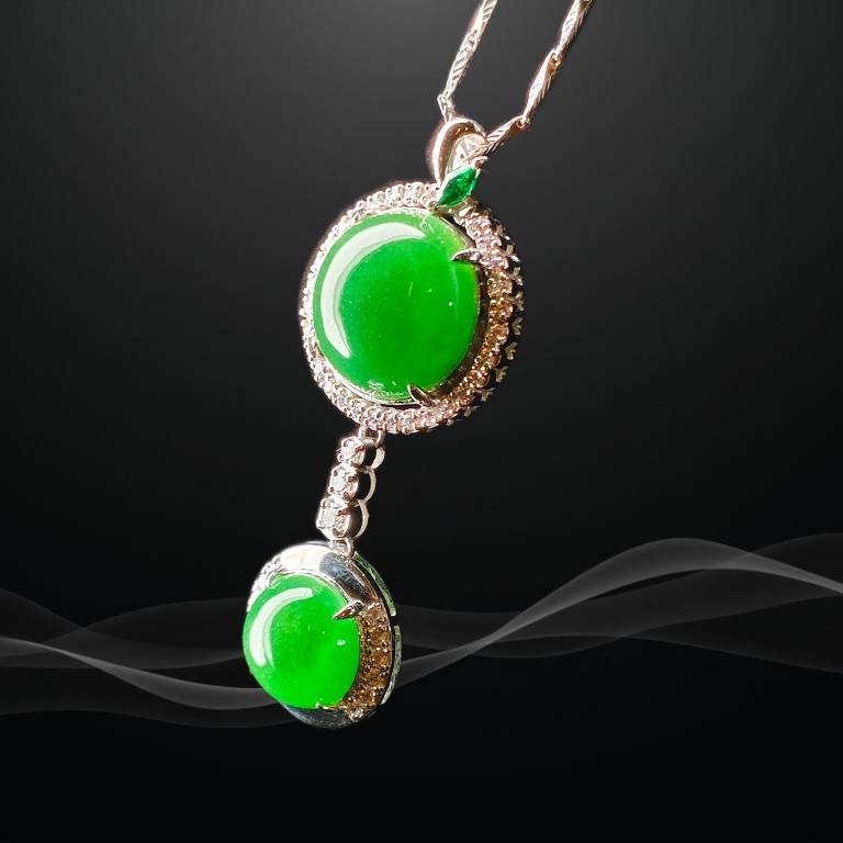 This necklace exudes a look of exquisite and timeless elegance. The pendant features a graceful double-circle design, set with two full, polished jadeite cabochons. These jadeite stones boast a deep, saturated emerald-green color, with a smooth, warm texture. Each jadeite is encircled by a brilliant halo of sparkling small gemstones, adding a luxurious visual contrast and linking the stones seamlessly. The overall design is clean and fluid. When worn, the gentle glow of the jadeite beautifully complements the shine of the accent stones, perfectly showcasing a woman's nobility and classic grace.